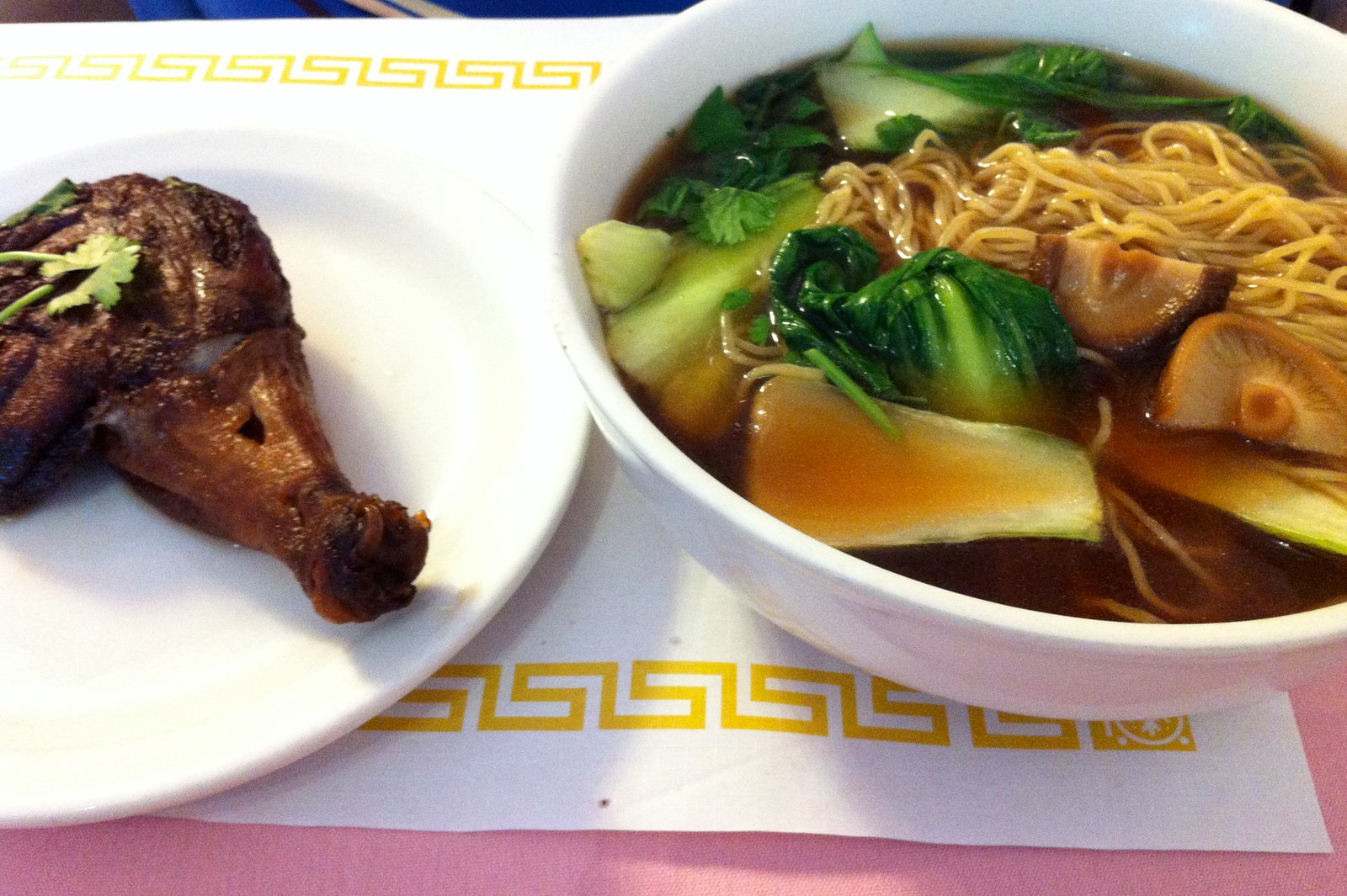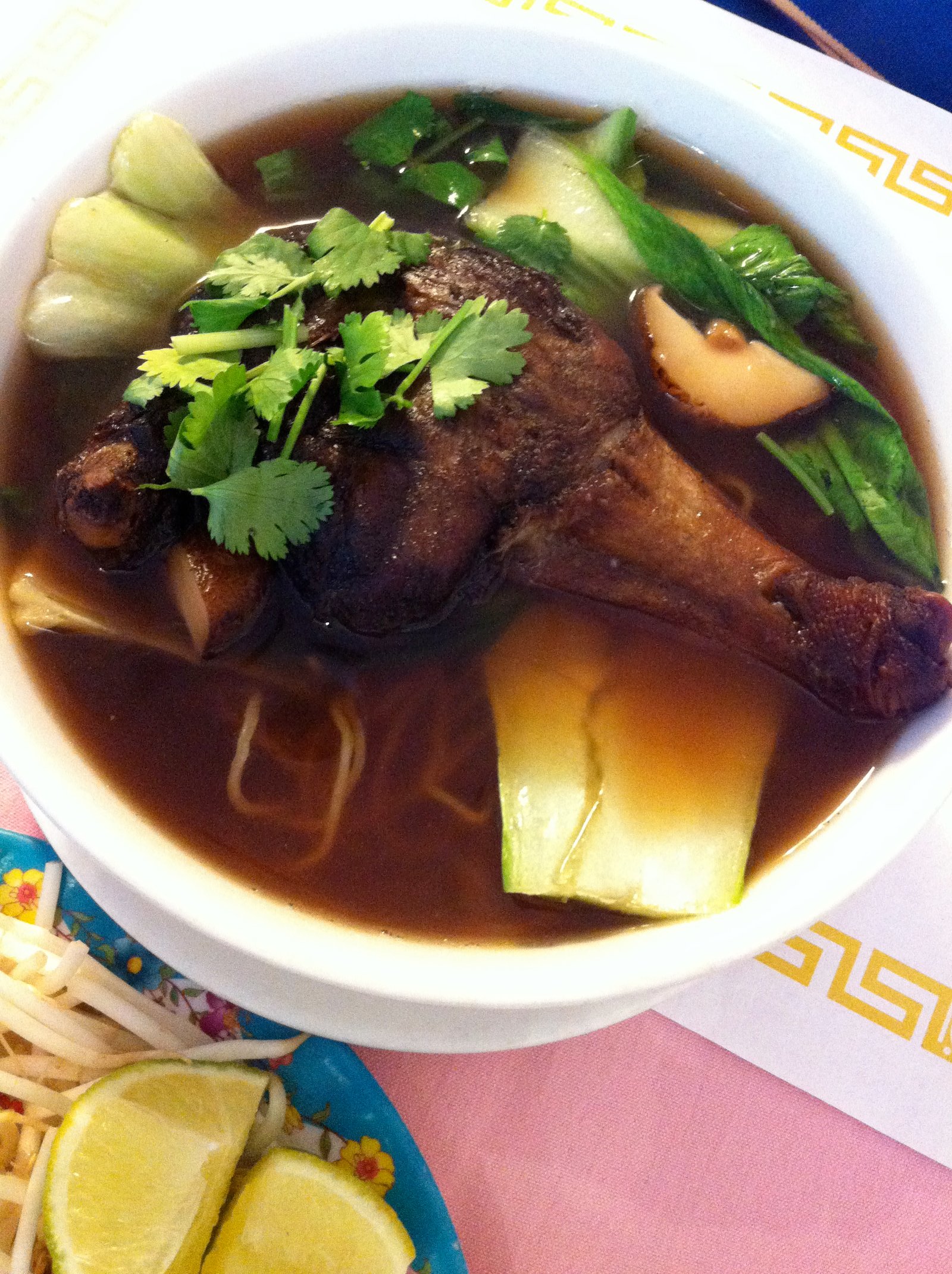 After reading Kirk's early December post of Bun Mang Vit, The Mister was wanting duck and ordered Mi Vit Tim ($7.99) egg noodle duck leg soup, dry (which didn't happen, as you can see in the top photo) but He managed after pulling out the wonderfully flavored duck leg.