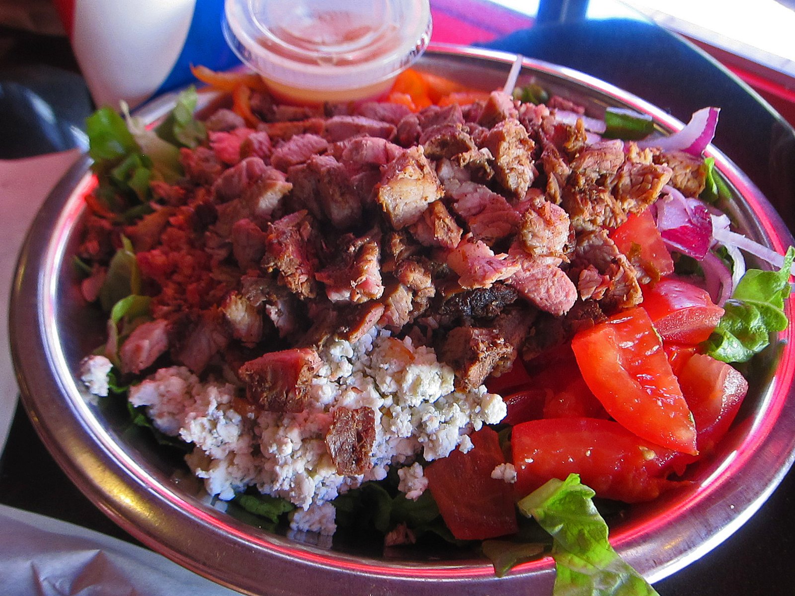 The Missus was ravenous and had me order the Steak Cobb Salad (Large $9.49), which is served in what looks like on of those metal mixing bowls.