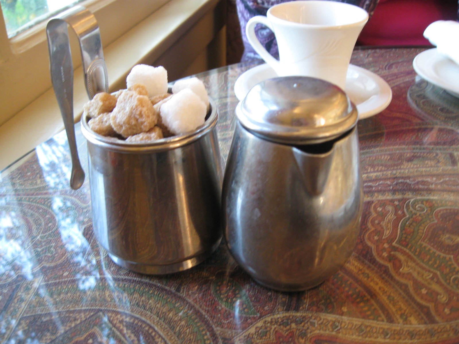 Each table had basic tea condiments – lumps of brown or white sugar and a small pitcher of milk: