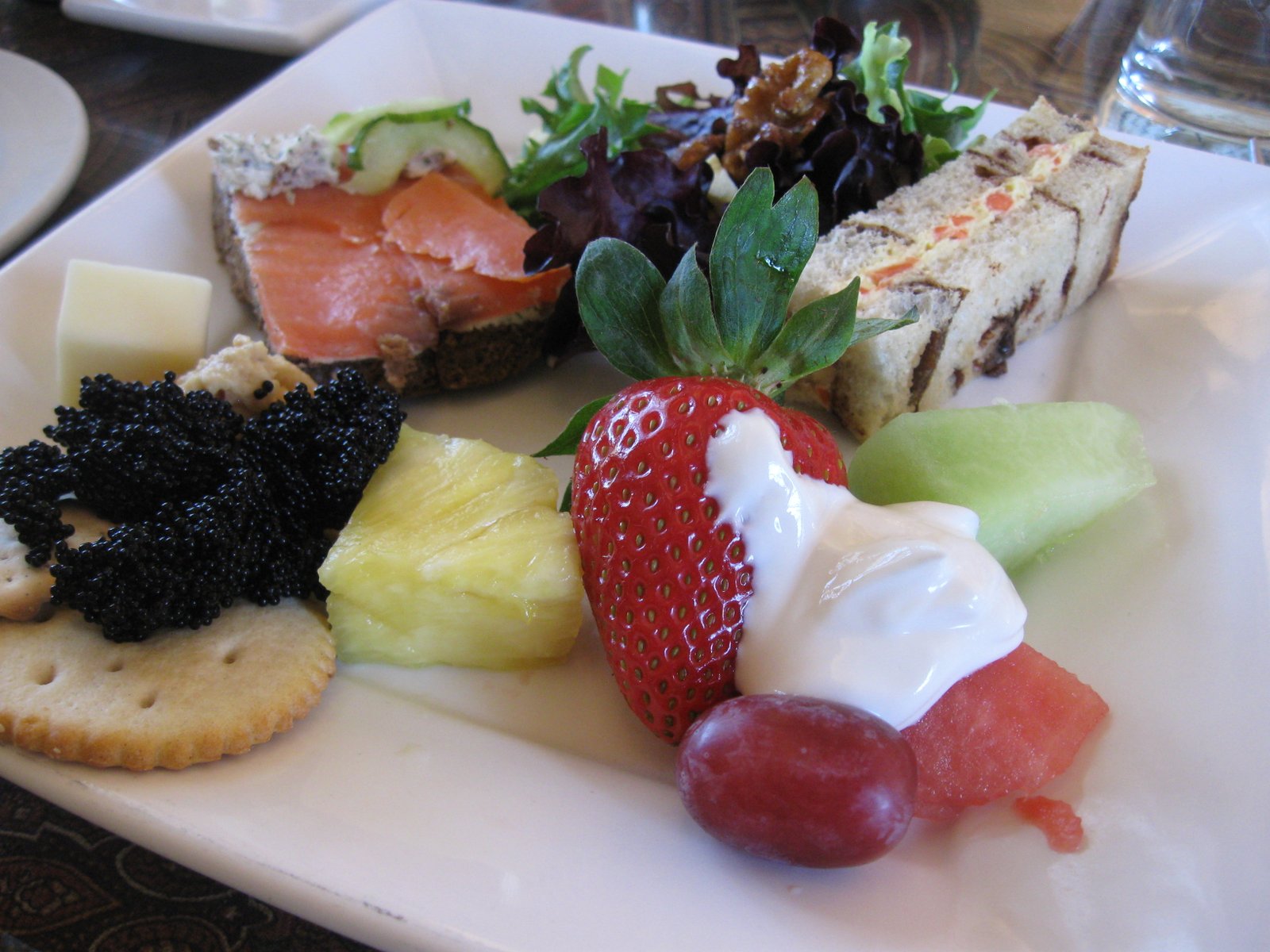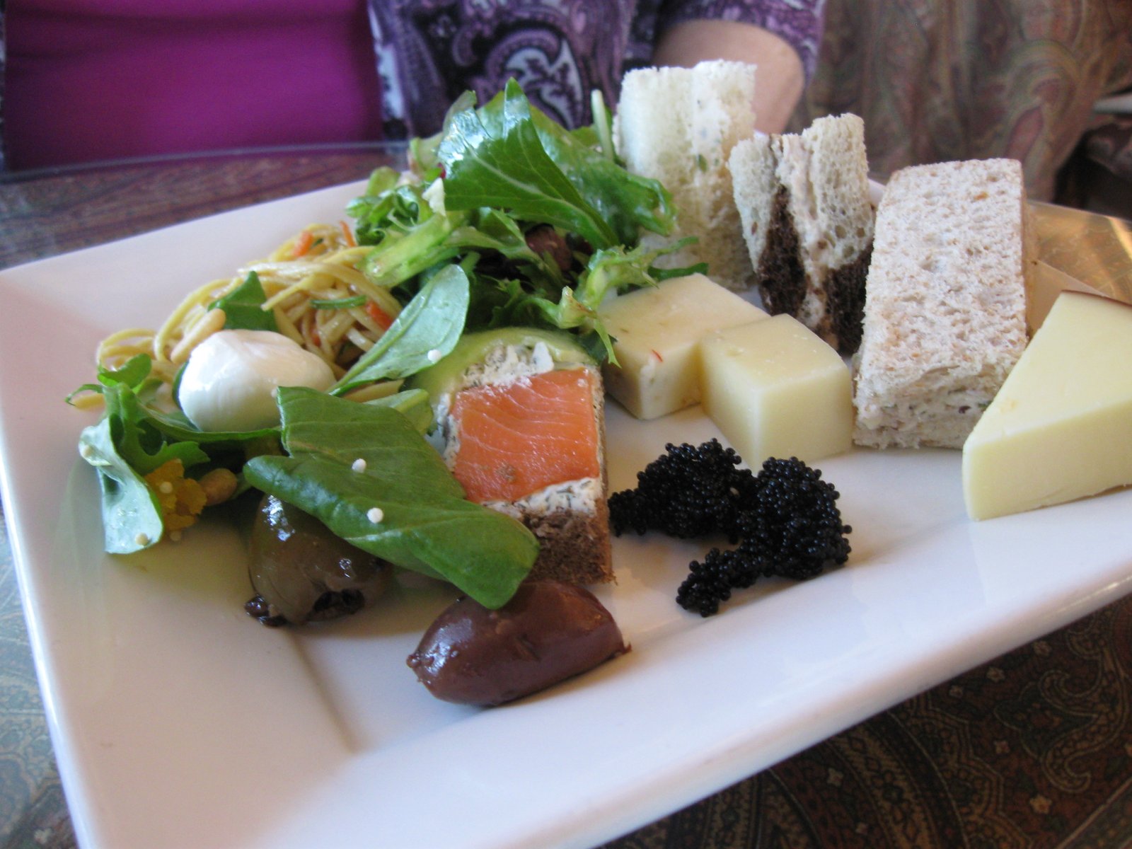 After gorging ourselves on scones – certainly the best either of us had ever had – we filled plates with treats from the buffet in the middle of the room. Here is Tina's first plate: