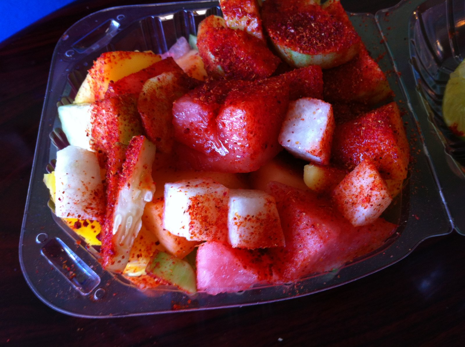This is a small pico de gallo($5.50)- bite size cut up fruits and vegetables, topped with a squeeze of lime and spicy salt. The fruits included grapes, mango, watermelon and papaya; vegetables were jicama and cucumber. Spicy salt is Tajin (or a similar item), just chiles, lime and salt. This is always refreshing.