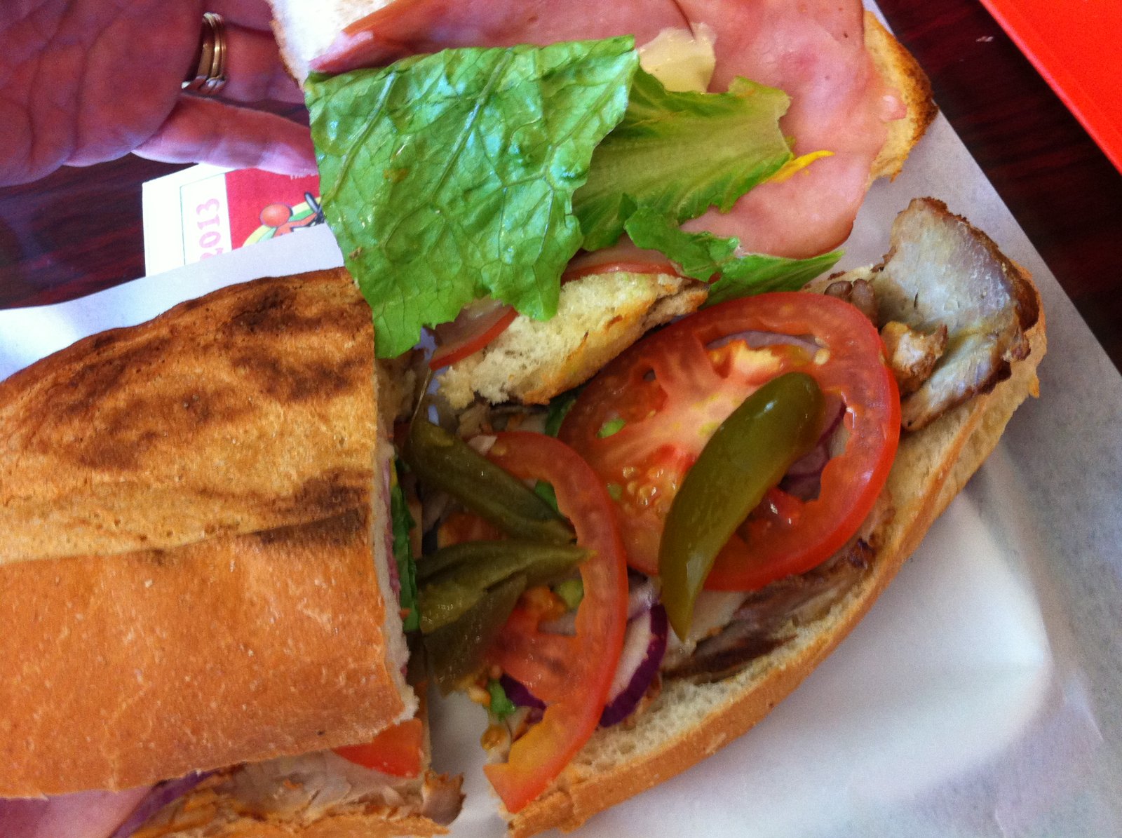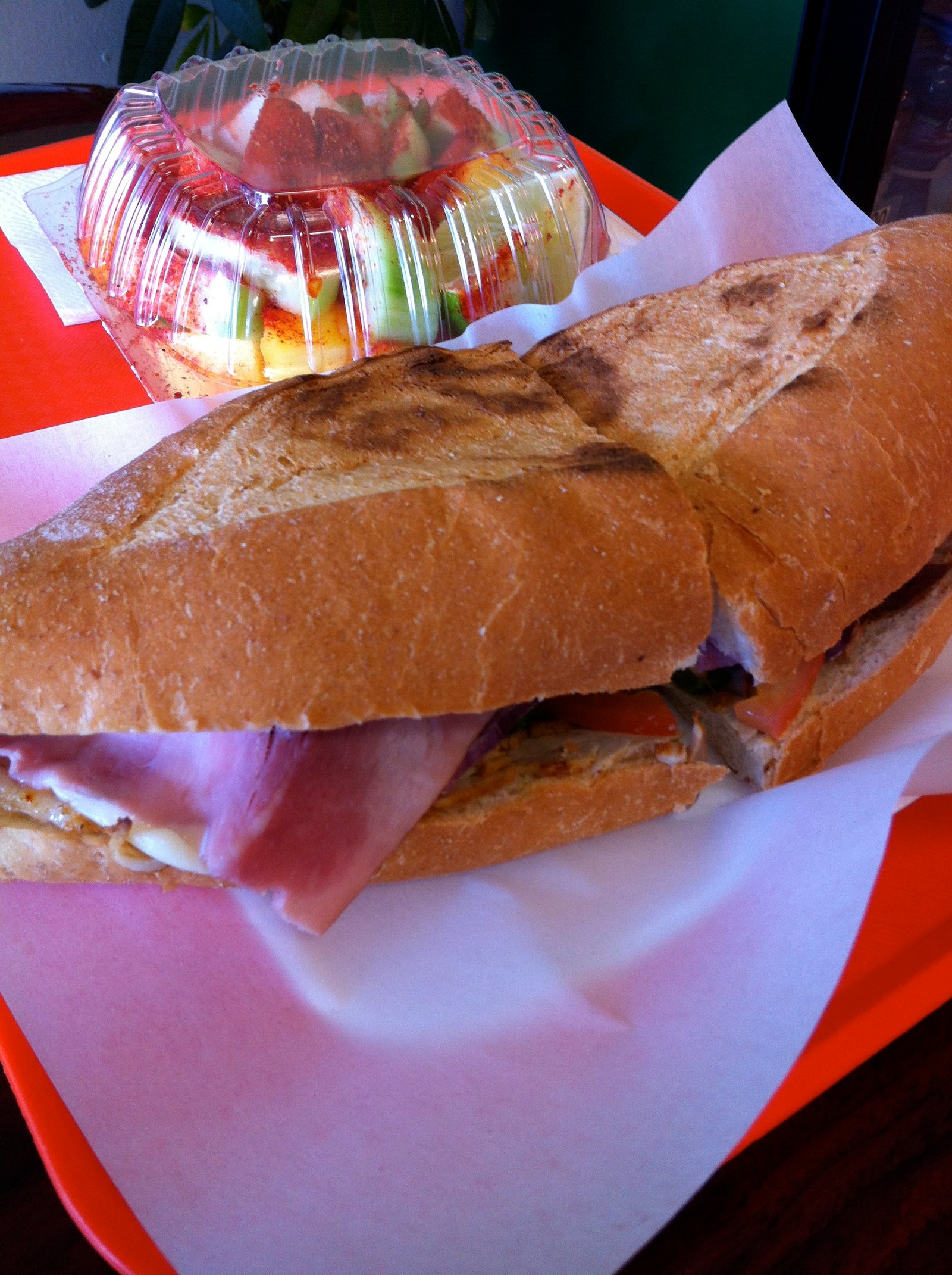This was the "Special Torta" ($6.50) which included both pork loin (lomo) and ham as well as lettuce, tomatoes, avocadoes and jalapeño strips on a freshly toasted bolillo roll.