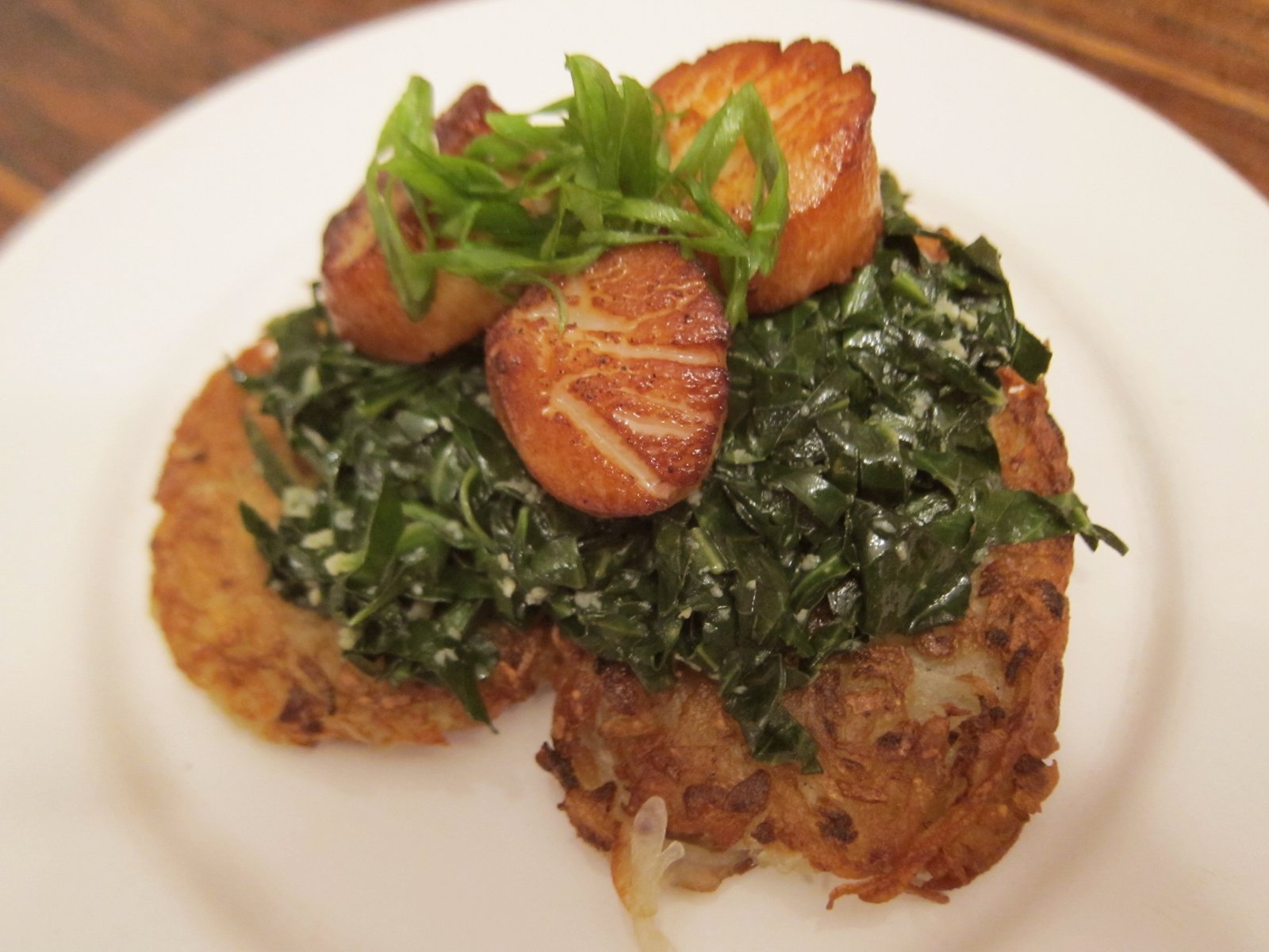 The fun with the name started when I decided to make Potato pancakes…….pommes darfine, hah! I really wanted a smoked infused scallop, but the problem being also getting a nice carmelization on it as well. So, like I did on a previous occasion with bluefin tuna, I got my stovetop smoker going full tilt and did a very hot smoke for 6 minutes. I then removed it from the smoker. Earlier I had rinsed, dried, and chopped collards (chou vert). Which I ended up chopping a bit thicker than a chiffonade. While the smoker was going I grated garlic and onions, squeezing out a good amount of the moisture. I then julienned the potato, seasoned, mixed together, formed and put aside. I then sauteed the collards, added grated garlic, and a dash of red win vinegar to give it that "pop". Potatoes were done next. While the potatoes were draining, I quickly seared the scallops over super high heat…….