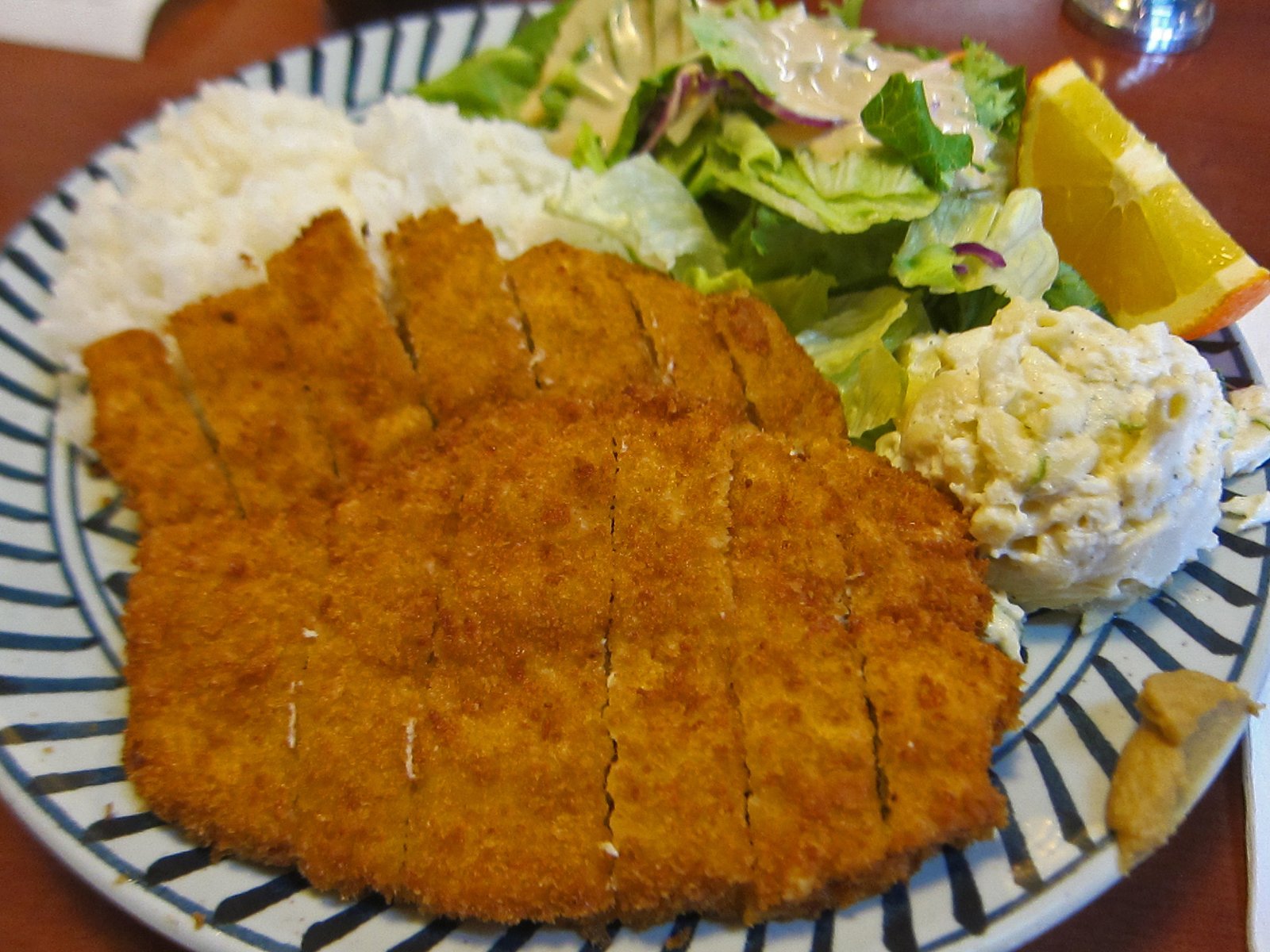 You really can't fault the portion size, though that green salad is much too large and the dressing too thin and sour. The potato-mac salad on the other hand is decent, but seems to have a bit of a citrus taste to it that I really don't care for.