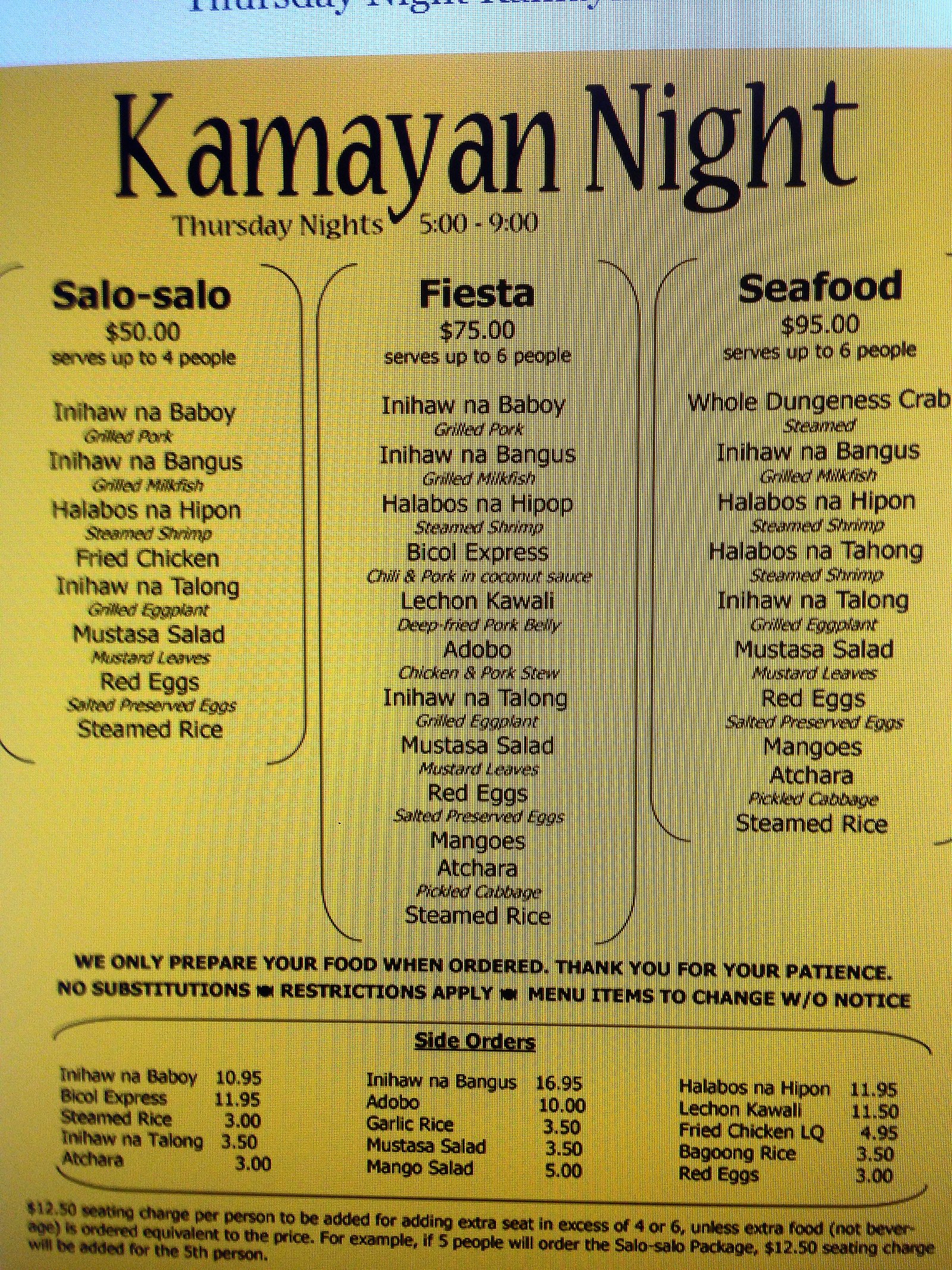 Kamayan Night only on Thursday – I suggest calling and making reservations.