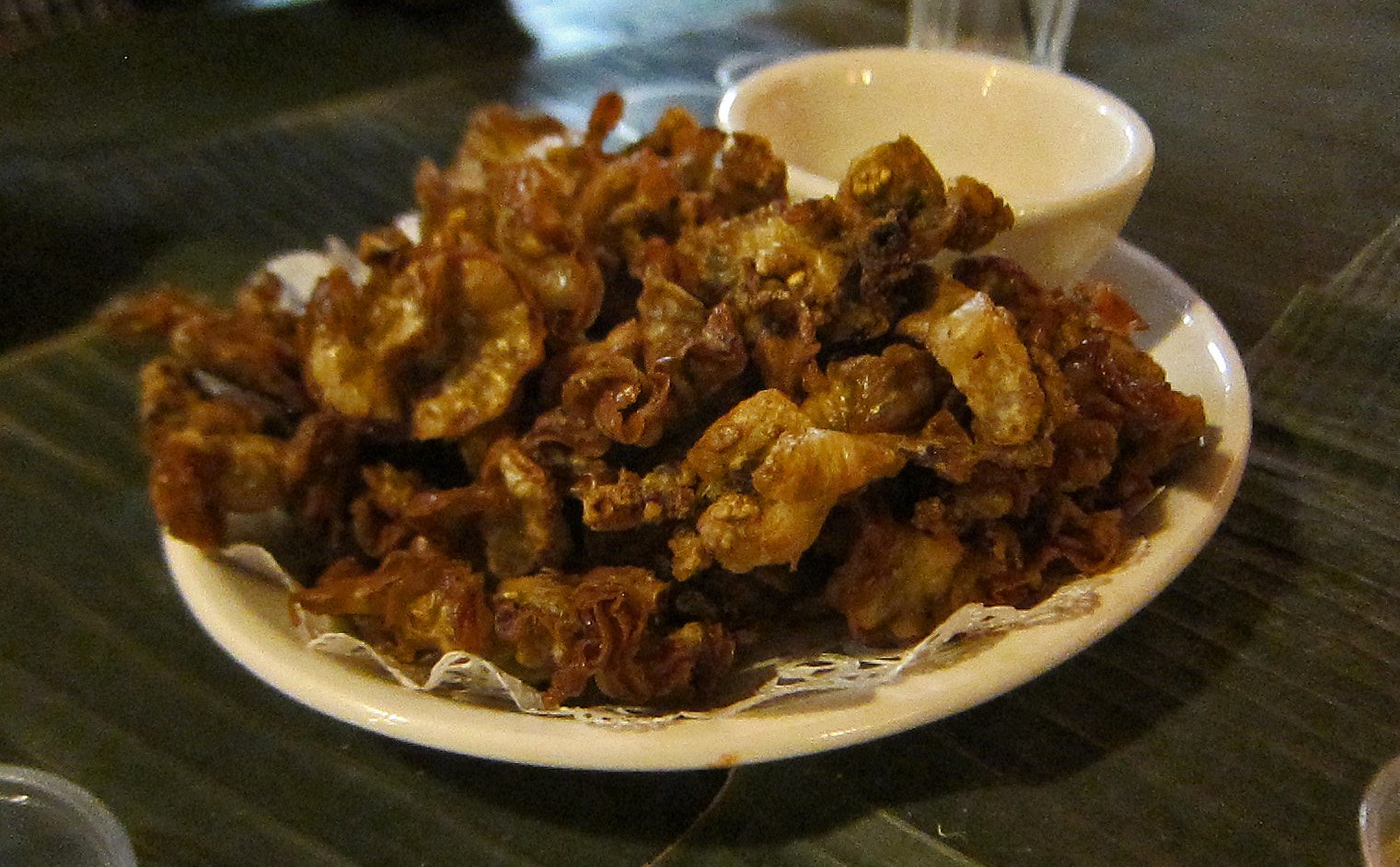 Anyway, having made reservations, our banana leaf draped table was ready when we arrived. And they quickly got our first supplement, the bulaklak, fried pork intestines, out to the table. Love the version here and can't get enough of it.