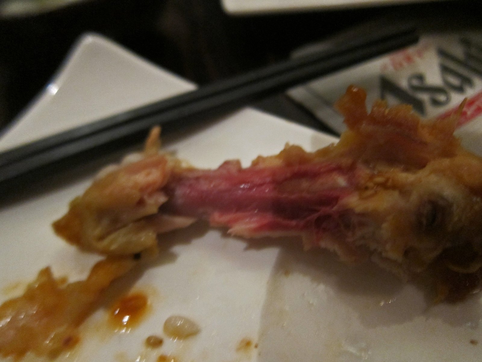 This wasn't very spicy, the flavor of the aka miso wasn't tempered making this salty. Also the wings were tough. After the first one, I stopped paying attention and was having a great time chatting with Candice….until I looked down and noticed that the last wing I ate was bloody red…….ick. I know, I have eaten chicken sashimi, but that was by my own choosing…….