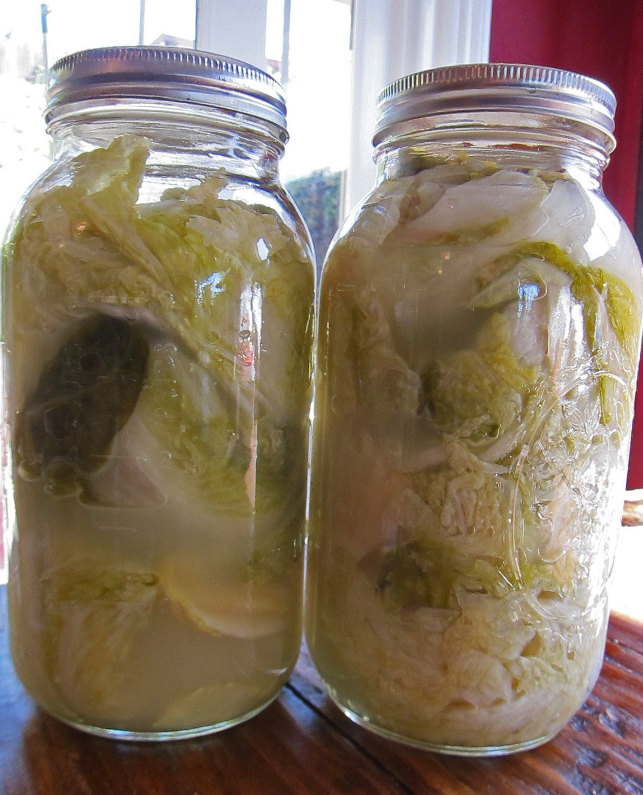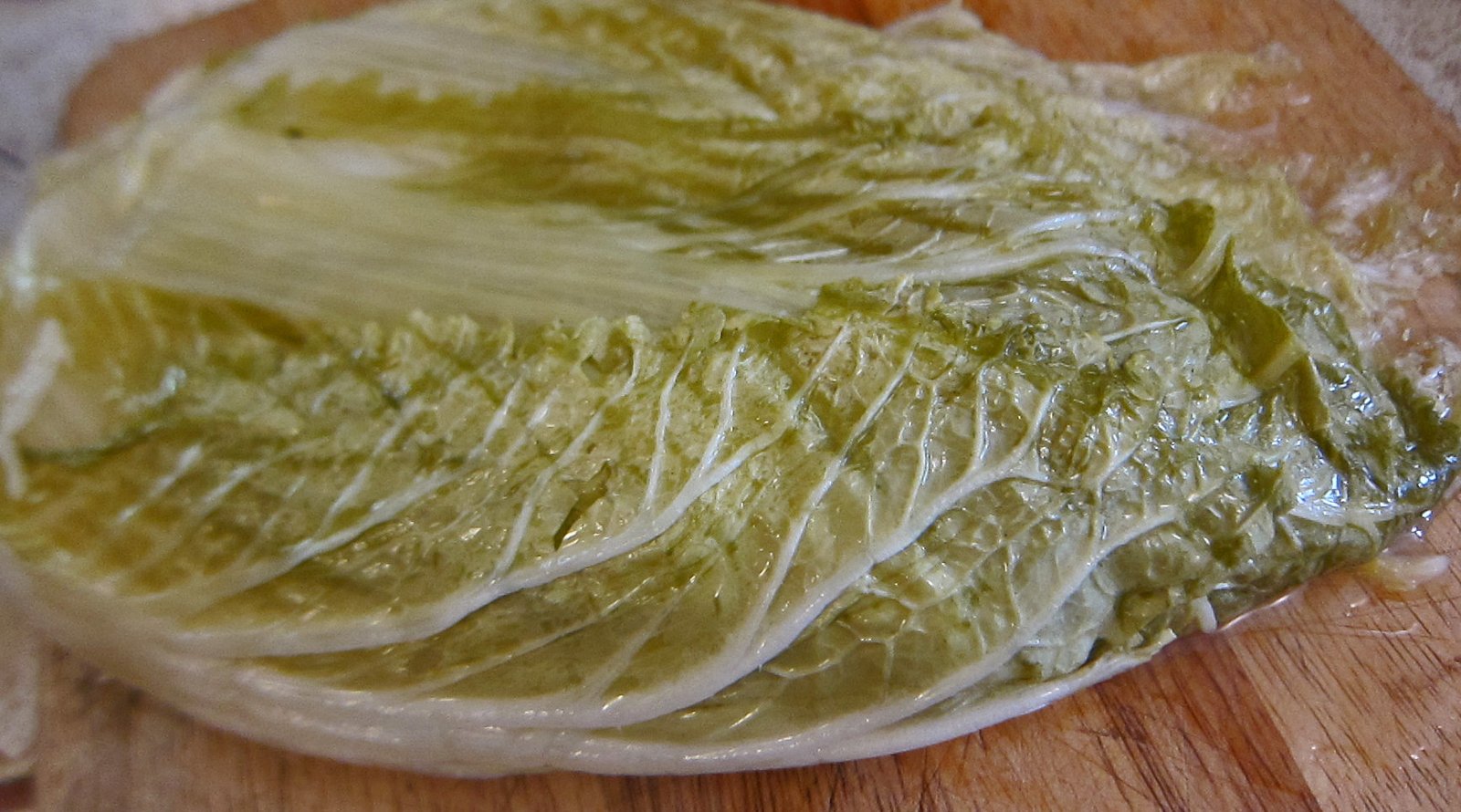 Actually, this was really easy. You look for fairly hefty napa cabbage. Half or quarter, use 8 grams of kosher salt per kilo, stuff into the crock, press down hard, and place the stones on the cabbage. Cover and use the water seal. There wasn't enough liquid to cover, so we did a check after the 5th day, pressed down more….by the 10th day things were really getting good….and pretty smelly in our hallway. We checked and found that enough liquid had now been drawn out of the cabbage to cover the whole batch. At 15 days, things looked pretty good……the Missus tore off a piece and handed it to me, telling me to "eat….eat"….. With some trepidation I had a taste and you could tell it was on it's way…at which time the Missus decided that I wasn't going to drop dead and had a taste Herself. The Missus' Aunt told Her it would take 22 days….why 22 days, I haven't a clue, it just seemed so random. When we opened the crock to check at 20 days, you could just tell by the color of the liquid and cabbage that it was ready. I had a bite and….it really tasted good; I mean really good, a sour-nutty, but not too salty flavor, the texture was perfect, with a nice crunchiness to it. It doesn't have that too salty-metallic twinge of the stuff you get at the market, loaded with nitrites and other preservatives…this one is salt, cabbage, and a lot of help from mother nature.
