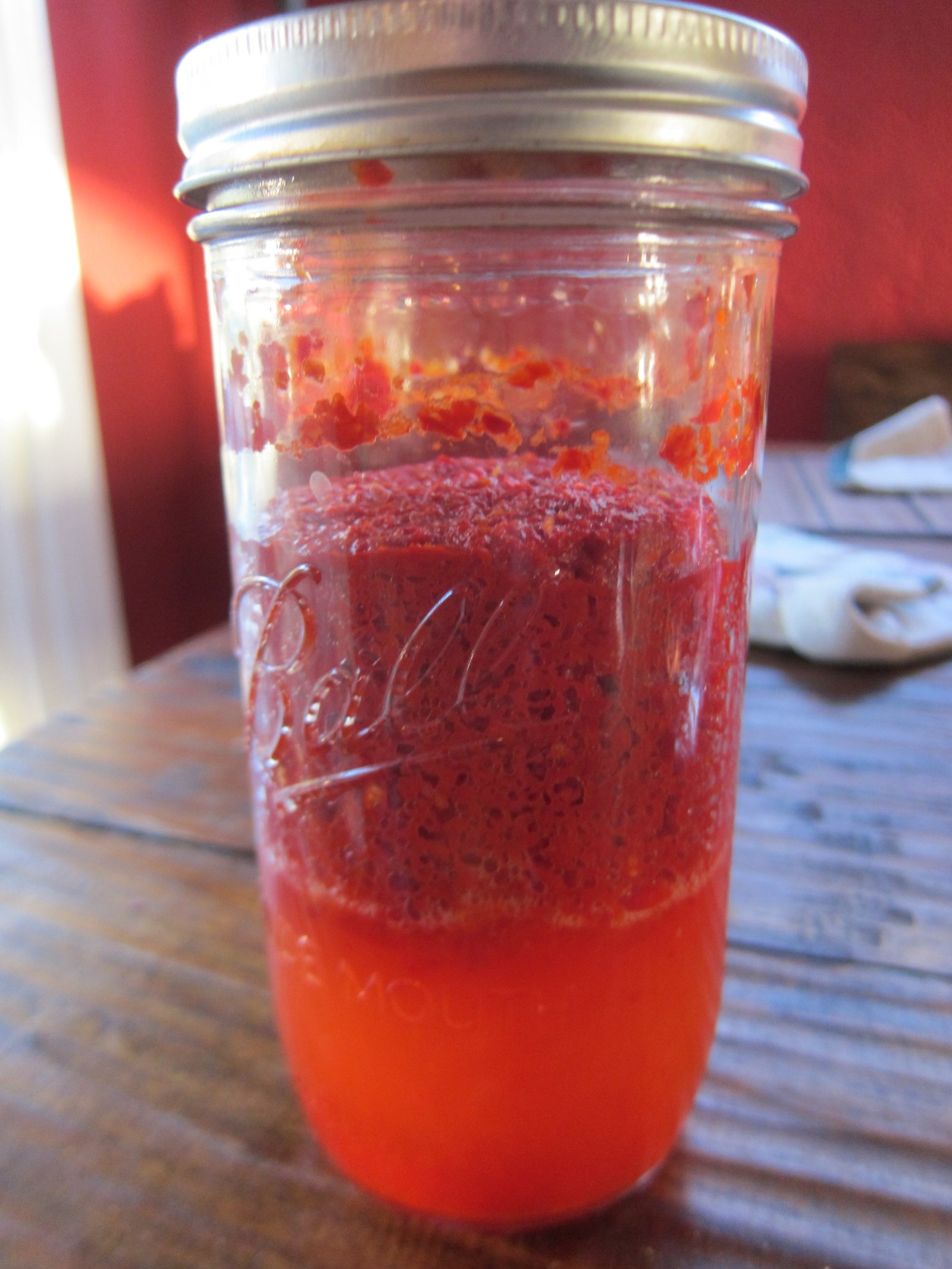 – You'll notice that the solids will separate from he liquids daily….you'll also notice the wonderful smell of garlic dancing around the area you ferment the chilies. Don't worry, it's worth it.