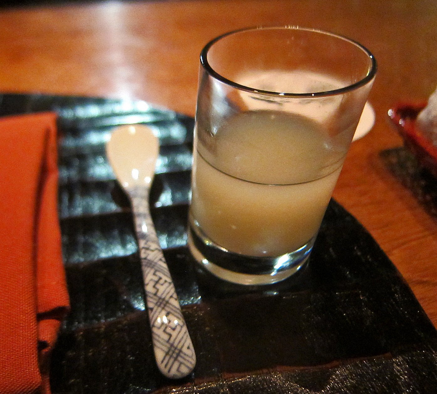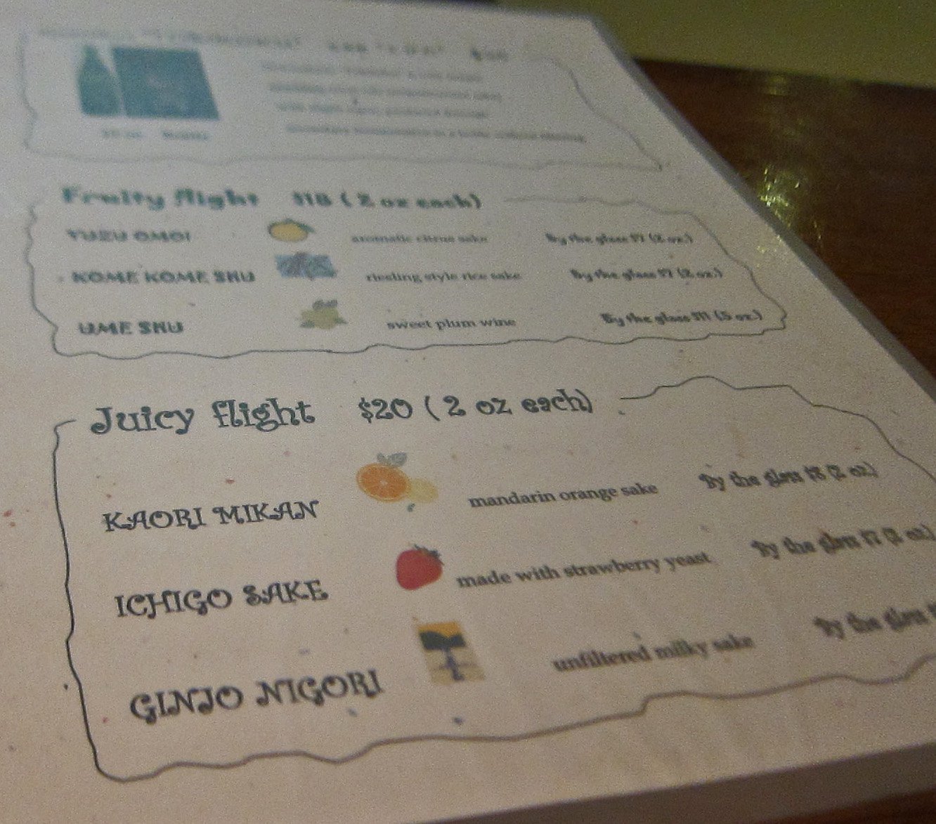 The Missus went with the "Fruity Flight"…the name still makes me laugh, with Yuzu Omoi – bascially yuzu infused sake, Kome Kome Shu – a light and tart "Riesling" like sake, and the Missus' favorite the Ume Shu.