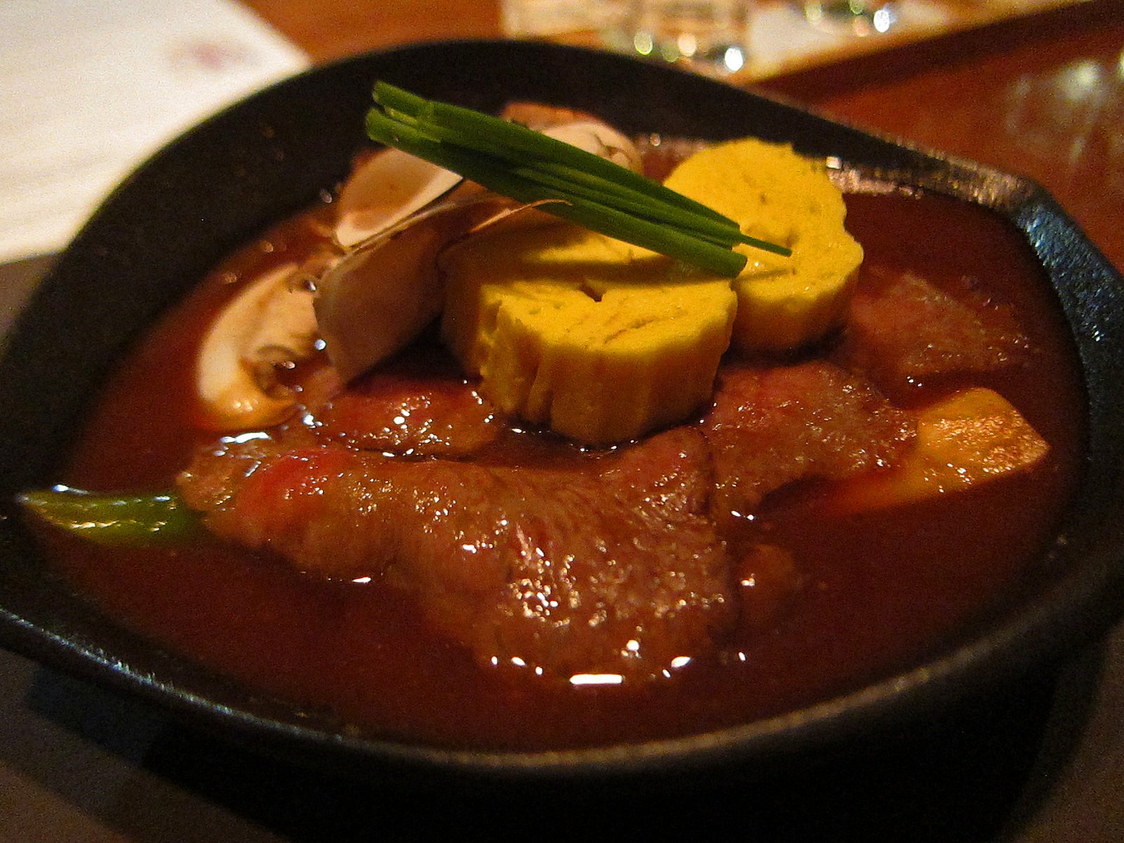 The next dish, the heaviest and most substantial was actually our least favorite of the evening; the wagyu no miso sukiyaki.
