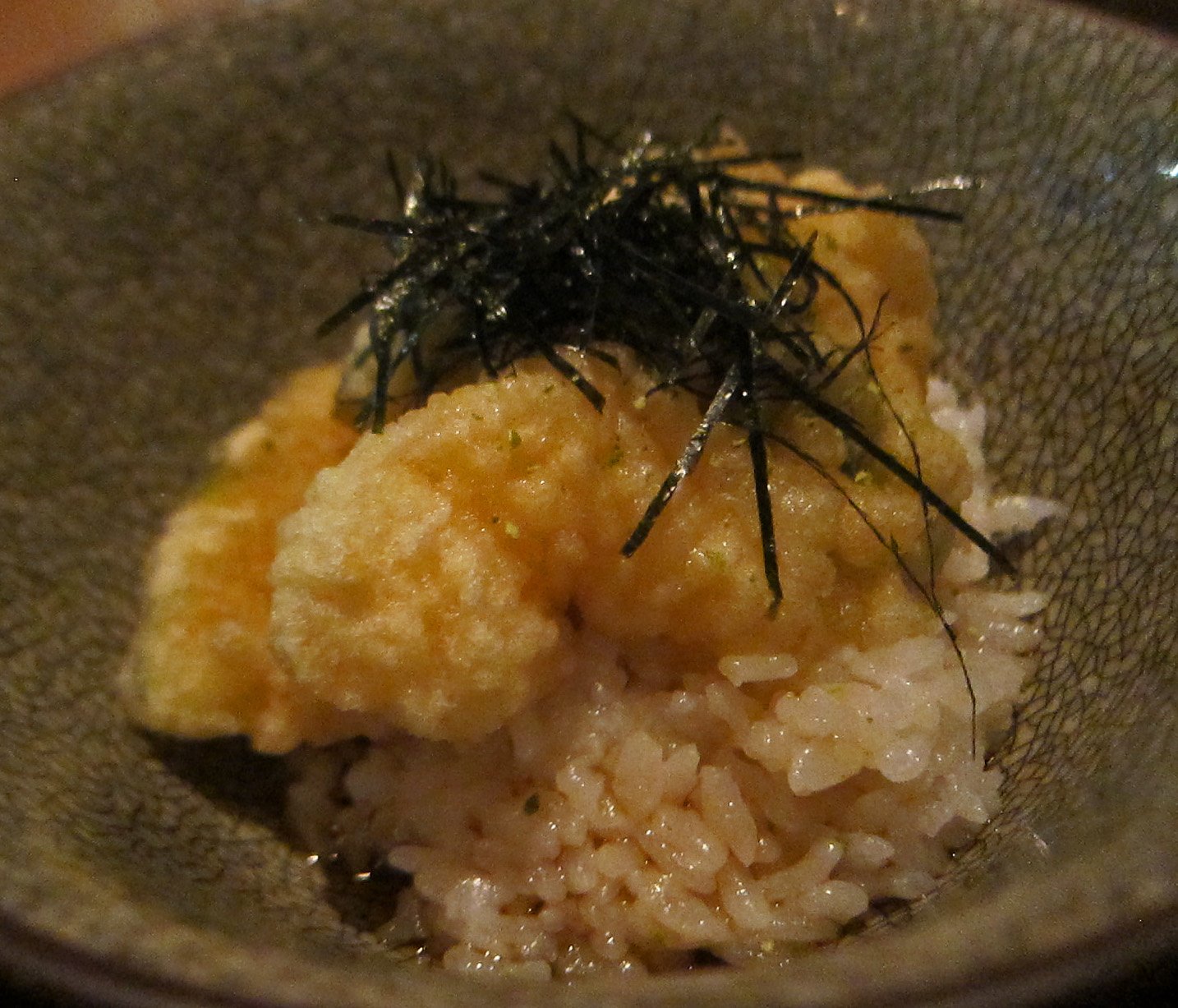 The end of the meal (except for dessert) was a typical Gohanmono – the rice dish. There was a choice of two offered, so of course we got one each.
