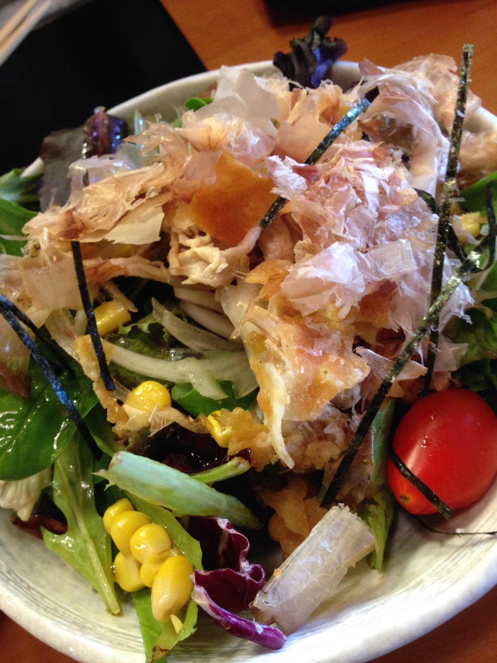 I ordered a small ($4) version of the salad everyone was ordering last time around, the Special Koubou Style Salad. The dressing itself is nothing special; seems ponzu based. There are strips of chicken and such, but it's the textures that make this a decent salad…the crunch of the corn and especially the torisenbei, chicken (skin) flavored chips that add to the it….good combination of flavors from the katsuobushi (bonito flakes) and the onions as well.