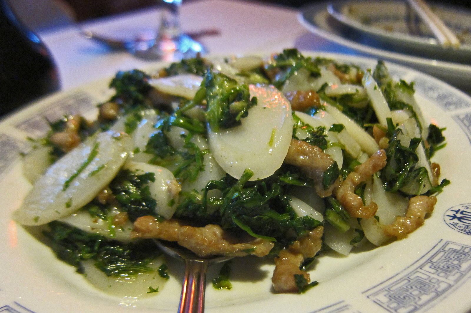 This was a decent version of the dish….you really can't get fresh ma lan tou here. I've seen it frozen at T&L and figure it's pretty much the same product everyone uses, but at least they didn't kill whatever flavor was left. In case you're wondering Ma Lan Tou is commonly known as Indian Aster and the vegetable is a staple of "Su Cai" – Jiangsu Cuisine, one of the Eight Great Traditional Cuisines of China.
