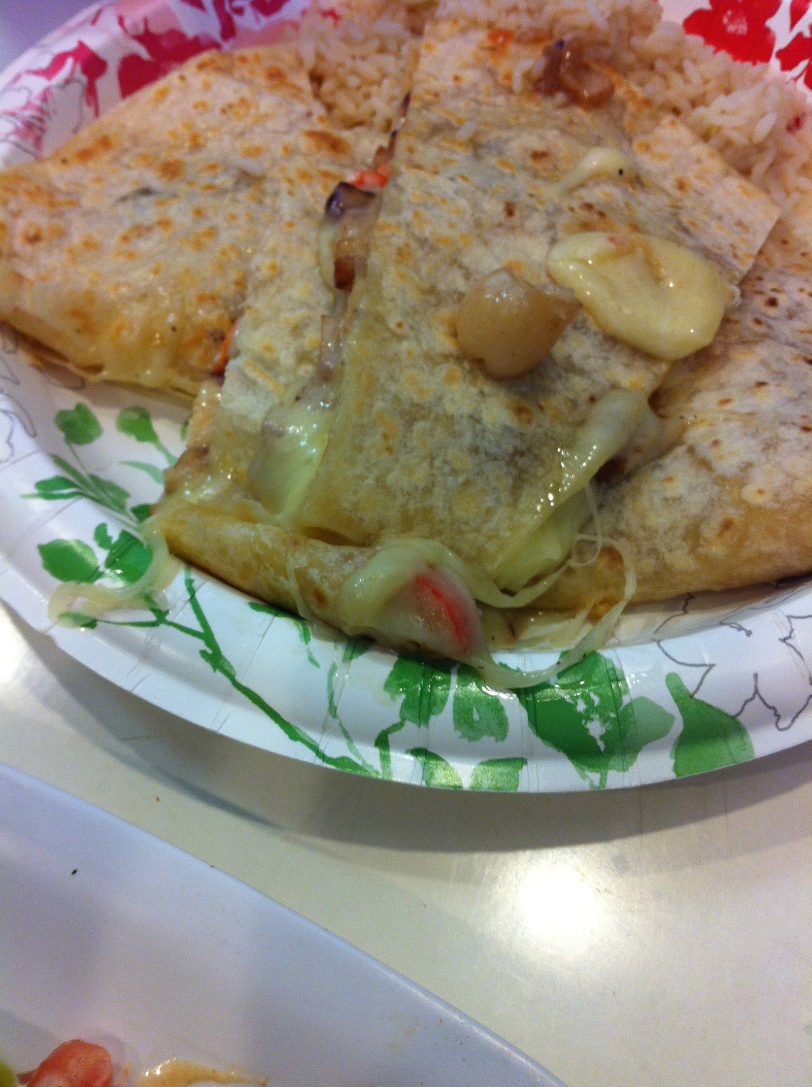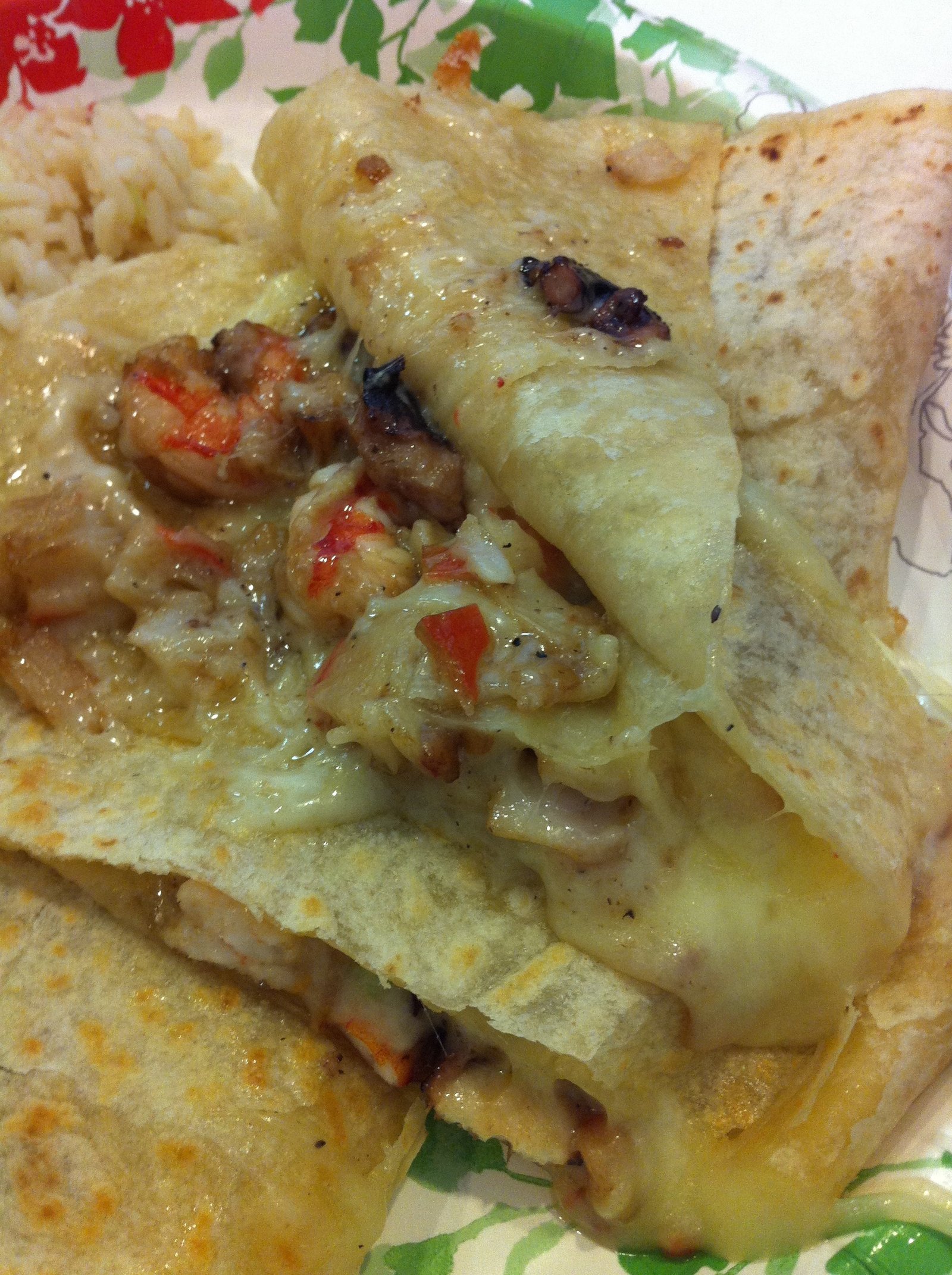 My comfort item here, the Seafood Pescadilla ($7.99). Served with rice, this Monterey Jack quesadilla is filled with sauteed buttery, garlicy shrimp, scallops, krab and octopus bits.