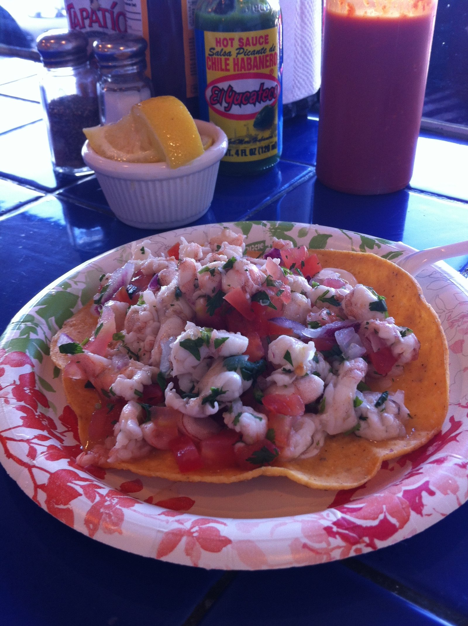 Another favorite of mine is the shrimp ceviche tostada ($3.75). Chopped plump, juicy shrimp that have been prepared in fresh lime juice with tomato, onion and cilantro. This is always satisfying on a hot day.