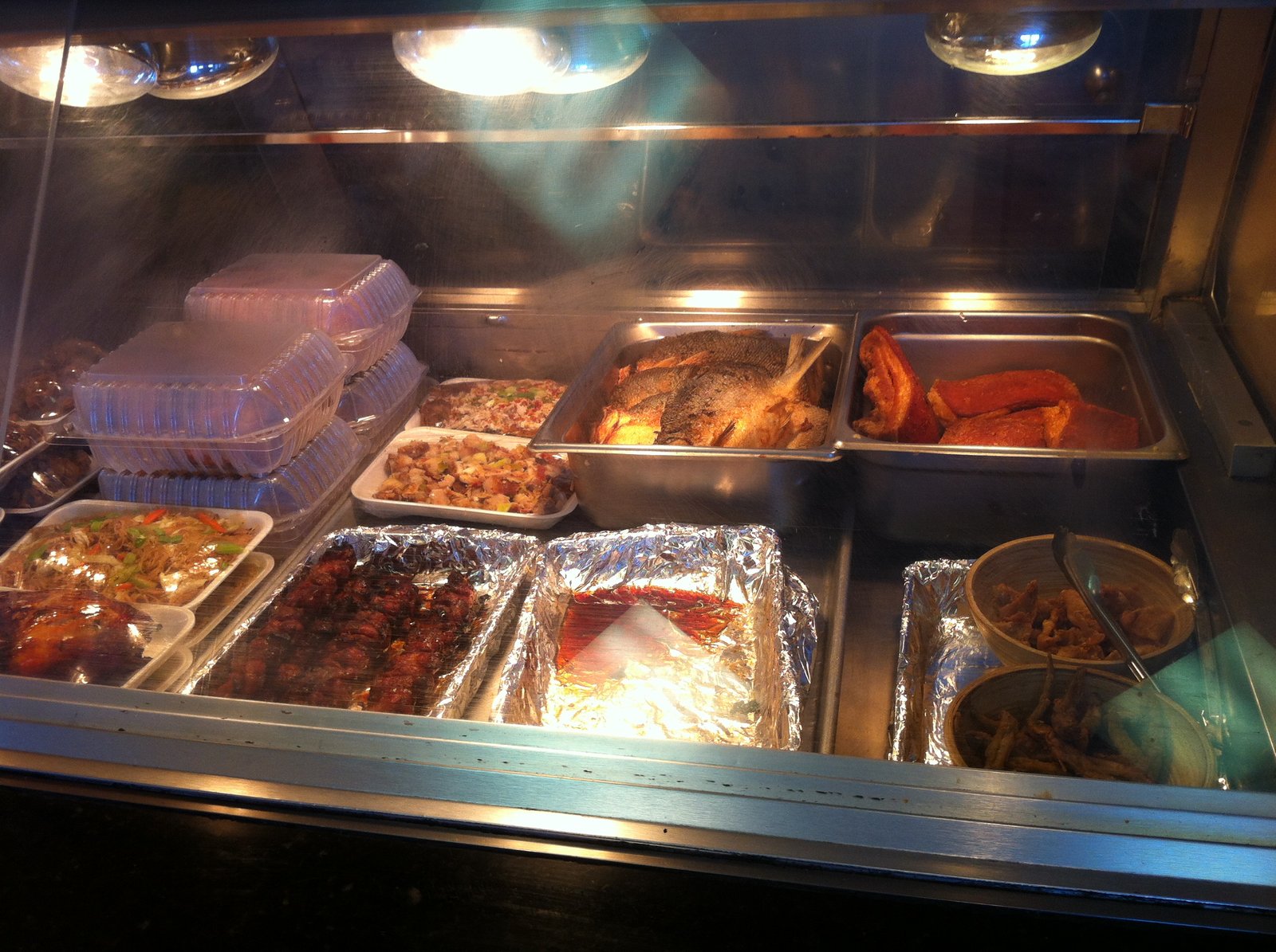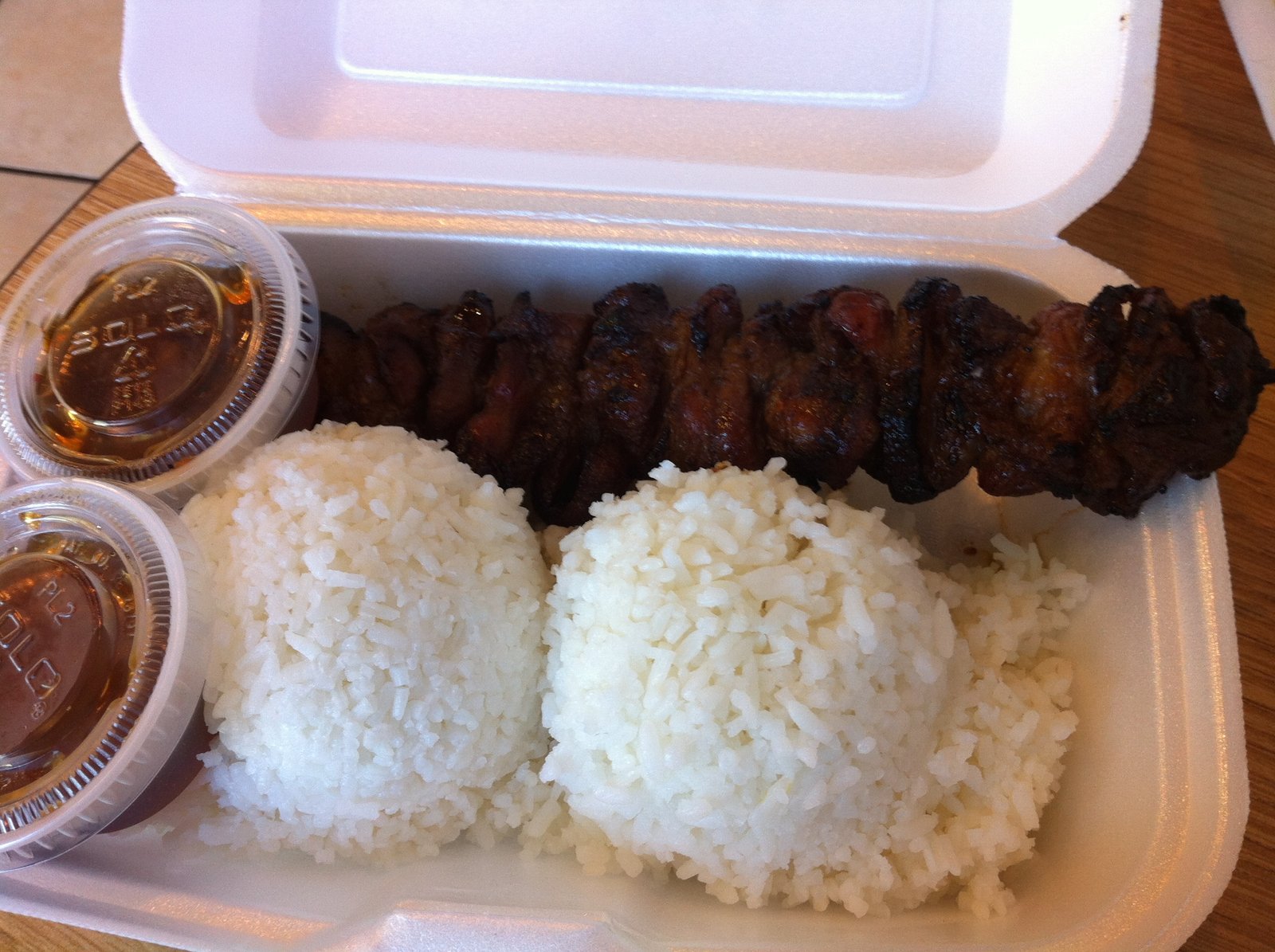 Yep, that's pretty much the entire menu on the wall (there is a sandwich board out front, listing some specials) and the other three photos are the entire counter, showing items available. We were here early, so everything was available.Above is a "BBQ Pork Stick Combo"($3.78)[The combo includes a choice of canned beverage]. The rice is jasmine and very good, the BBQ pork stick is moist and has good flavors (there is vinegar in the marinade, making it not so sweet, which I like).