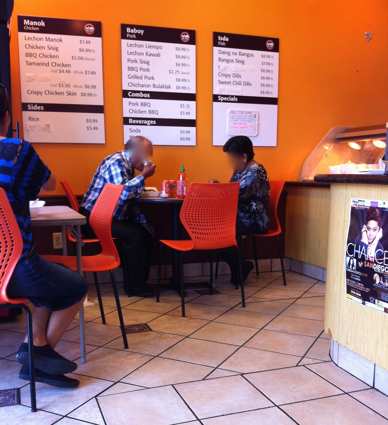 So, let's get some things cleared up right now. A) Baboy is Tagalog for pig/pork. The name of this restaurant is a shortened version of Chicken-Baboy, or Chicken-Pig, which are two of the primary items served here. There also is fish on the menu (Isda in Tagalog), but that word doesn't fit the signage in a non-double entendre way. {I'll wait while you go through the possible combinations in your head} 2. There are three tables (with a total of eight chairs) to sit at inside this tiny shop, so if you are here and can't find a place to sit and eat, don't be surprised. Located in a a mall anchored by Popeye's and Starbucks, across the way from a McDonald's, Chic-Boy is one of more than eight Filipino owned businesses in this mall near the South East corner of 805 at Plaza Boulevard. Despite my tendency to blog about places and food items that nobody else has blogged about, I was happy to find Faye did blog about Chic-Boy last year. Now I don't feel too far out of the loop and am glad to share one of her (an my) (and cc's) snack food favorites with you (hint: last photo of this post).