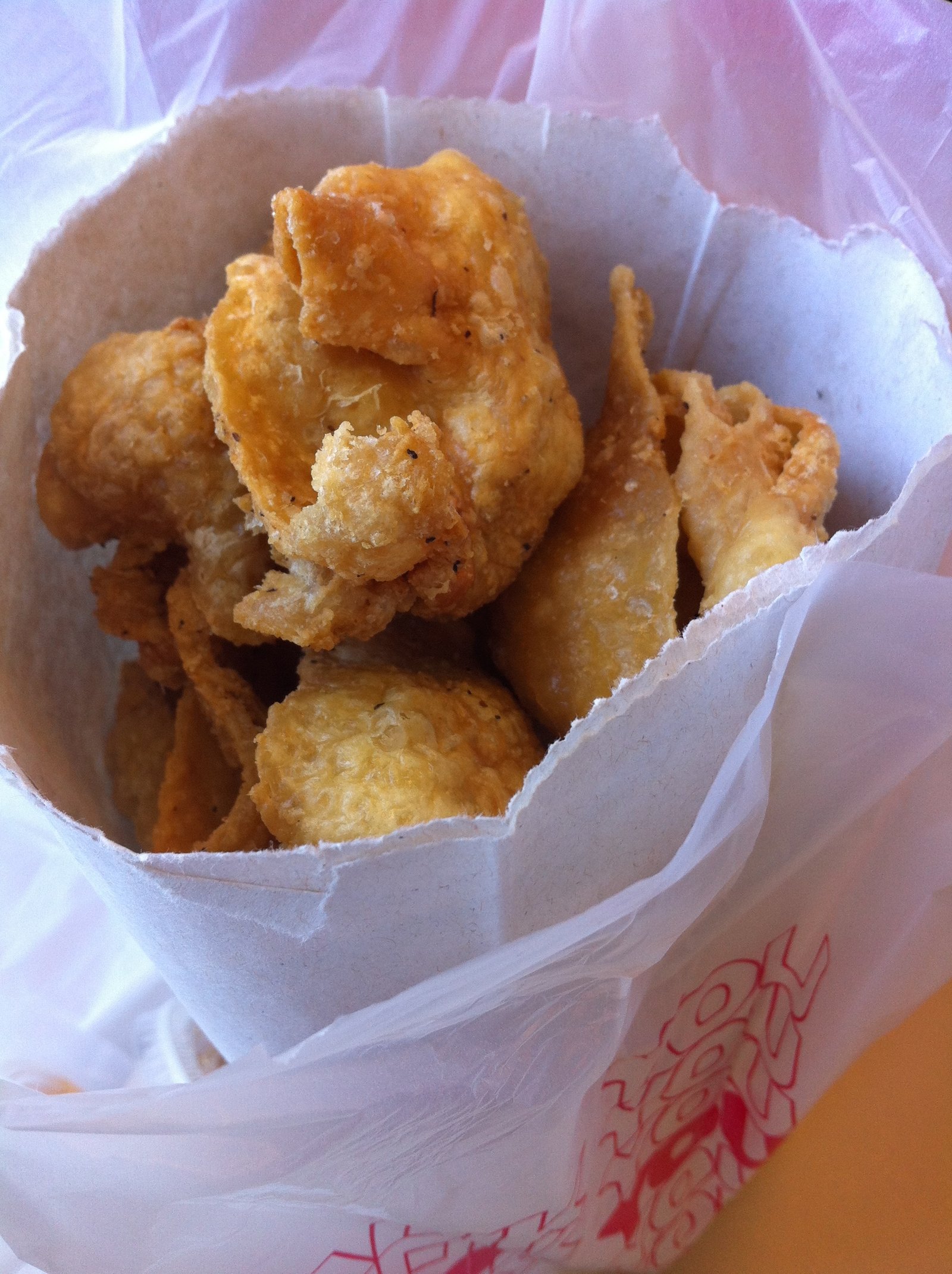 Those greasy bags to the left in the glassed in area? Fried dilis (anchovy), fried bulaklak (pork intestines) and, above, fried chicken skins(the snack of choice by both Faye and myself). Each priced the same, ($8.99/lb) and served with a cup of garlic infused vinegar, a perfect, tasty, non-carb snack.