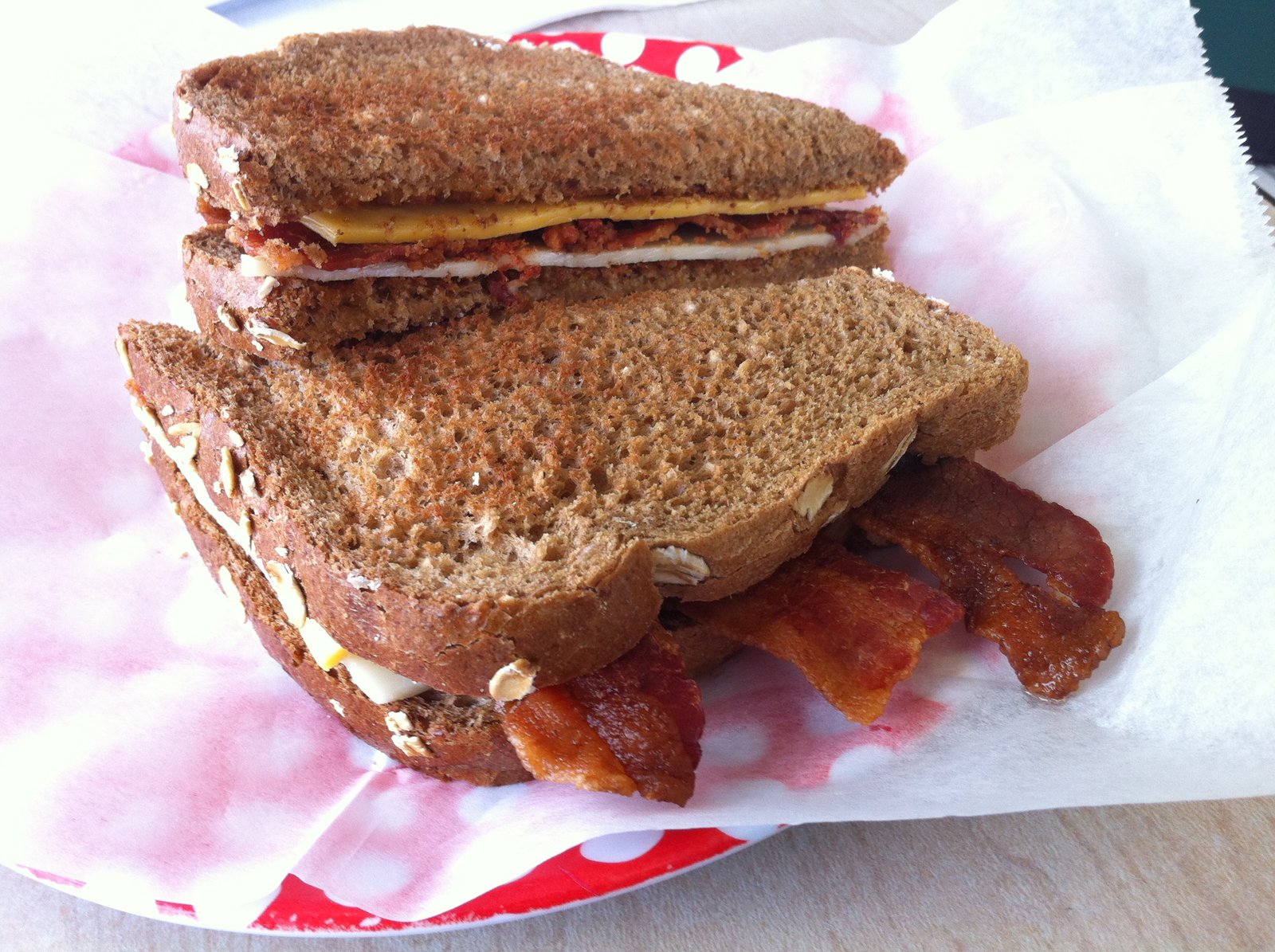 Above, is the "Early" sandwich ($3.65, combo $5.10). Served on a choice of white, wheat or sourdough toast with good, crisp bacon and, as you can see, two cheeses.