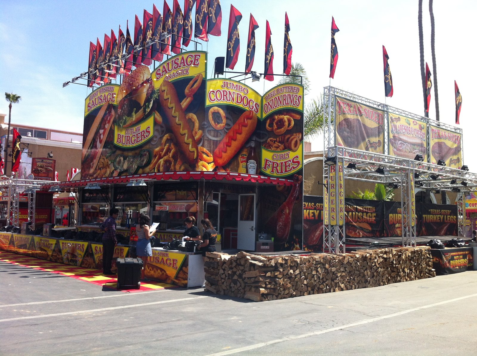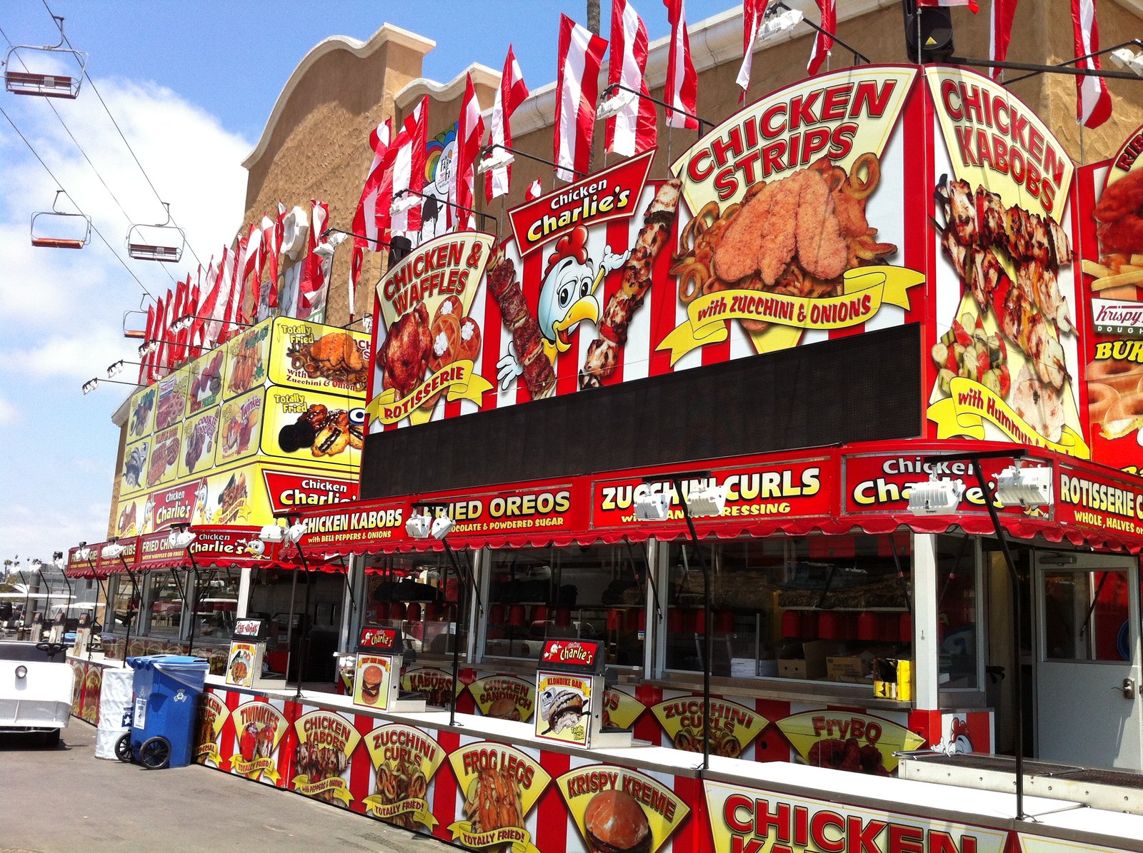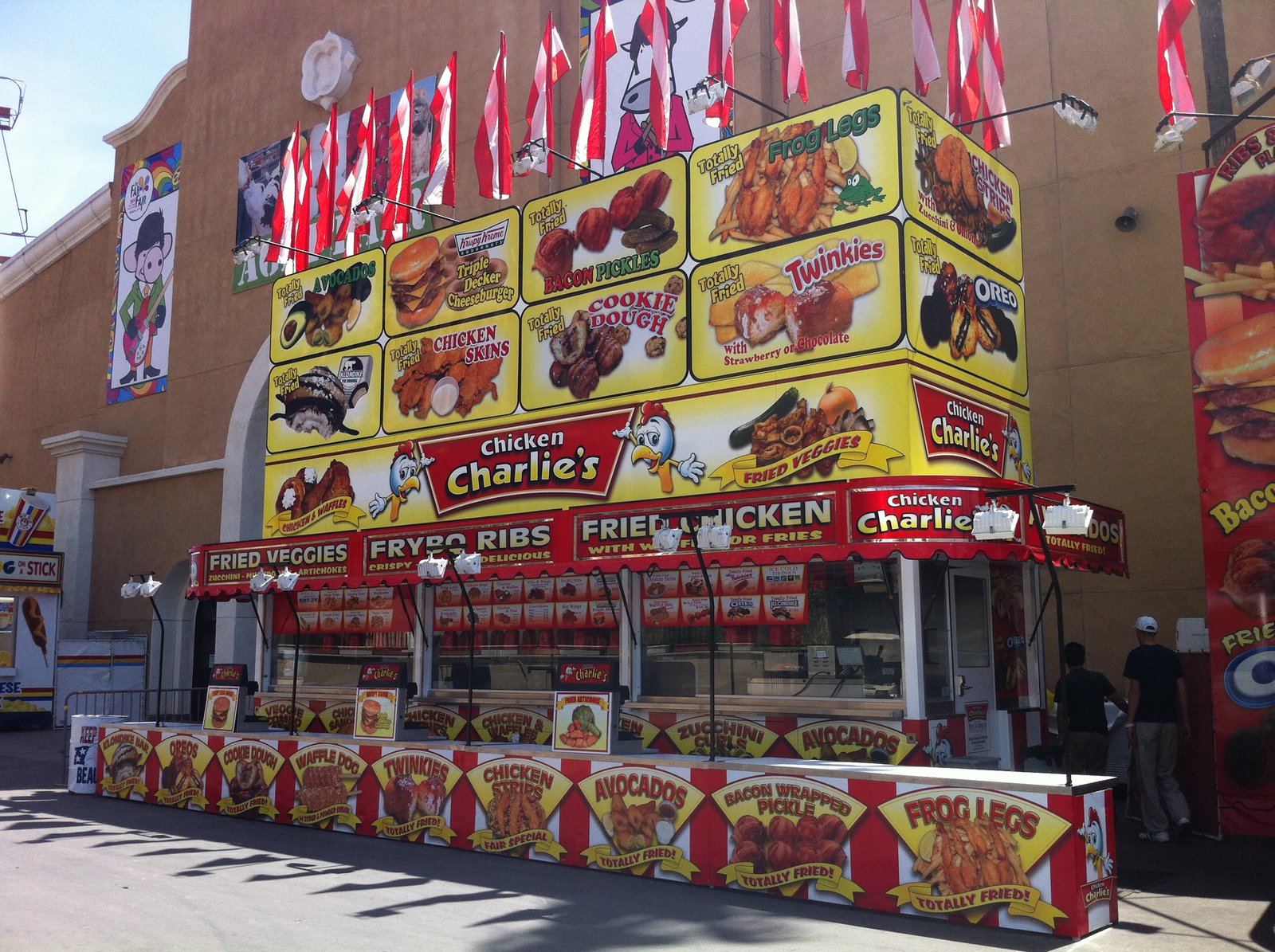 Chicken Charlie's will be opening a Brick and Mortar store in San Diego later this year, ostensibly to test new food items for the 2015 Fair season (and beyond) For now, the new items are listed in the signage above (fried chicken skins and that delightful looking triple decker cheesburger with a Krispy Kreme donut bun).