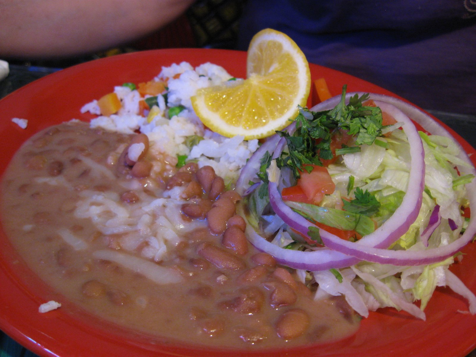 It came accompanied by tortillas, excellent vegetable rice, chopped lettuce and tomato, fresh red onion rings, and slightly refried pinto beans that Tina especially appreciated: