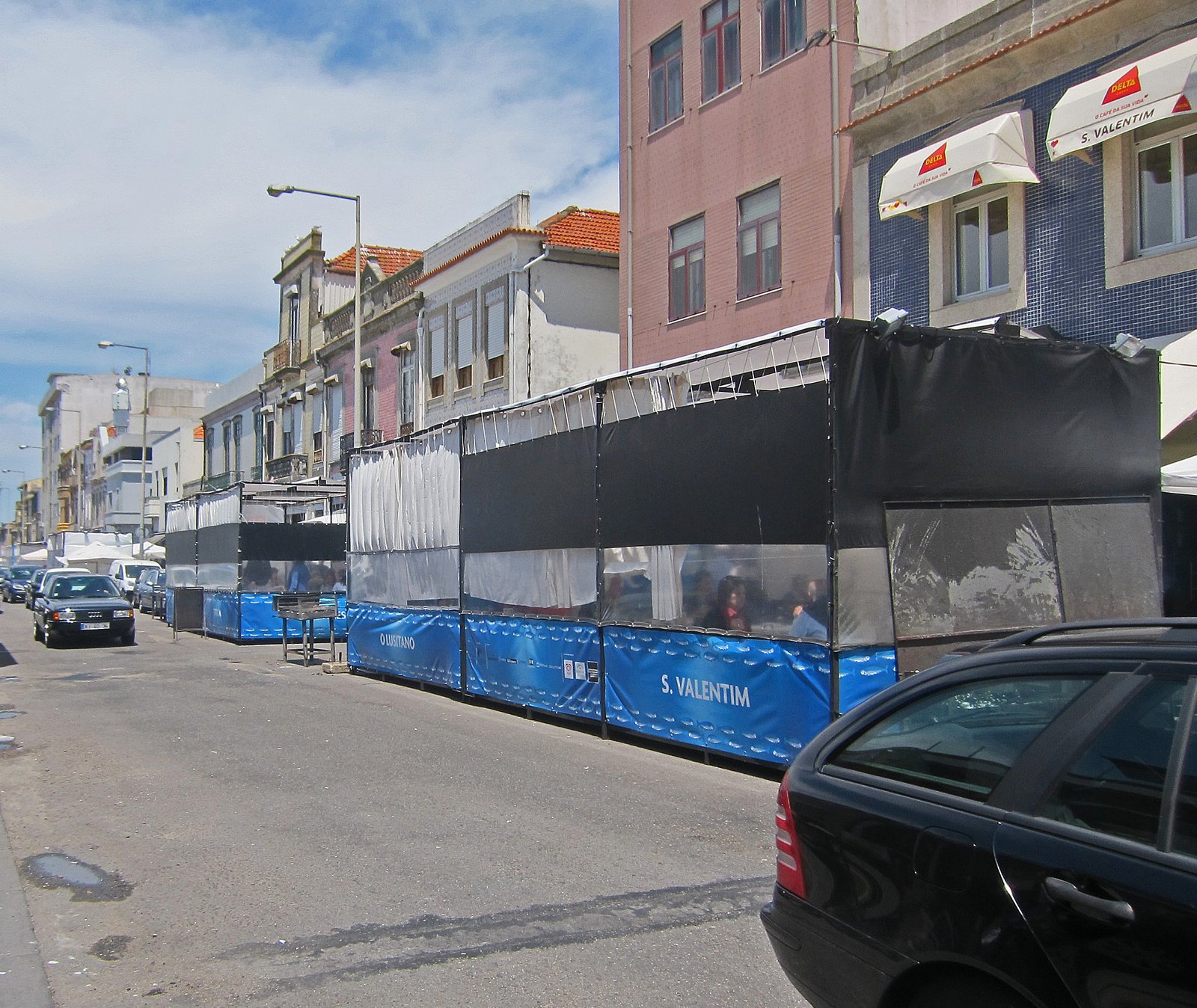 We headed down a bit, turning on Rua Herois de Franca and after a couple of blocks things started perking up a bit. We hit a restaurant row. Each restaurant had what looked like makeshift dining areas set-up in front, which seemed to be built on wooden pallets.