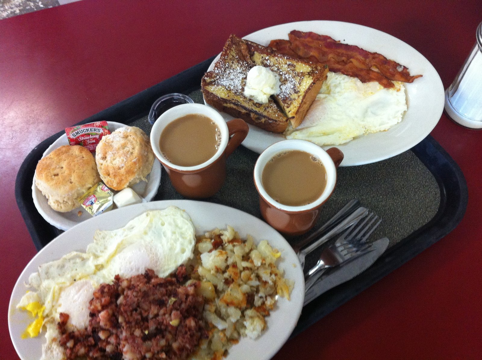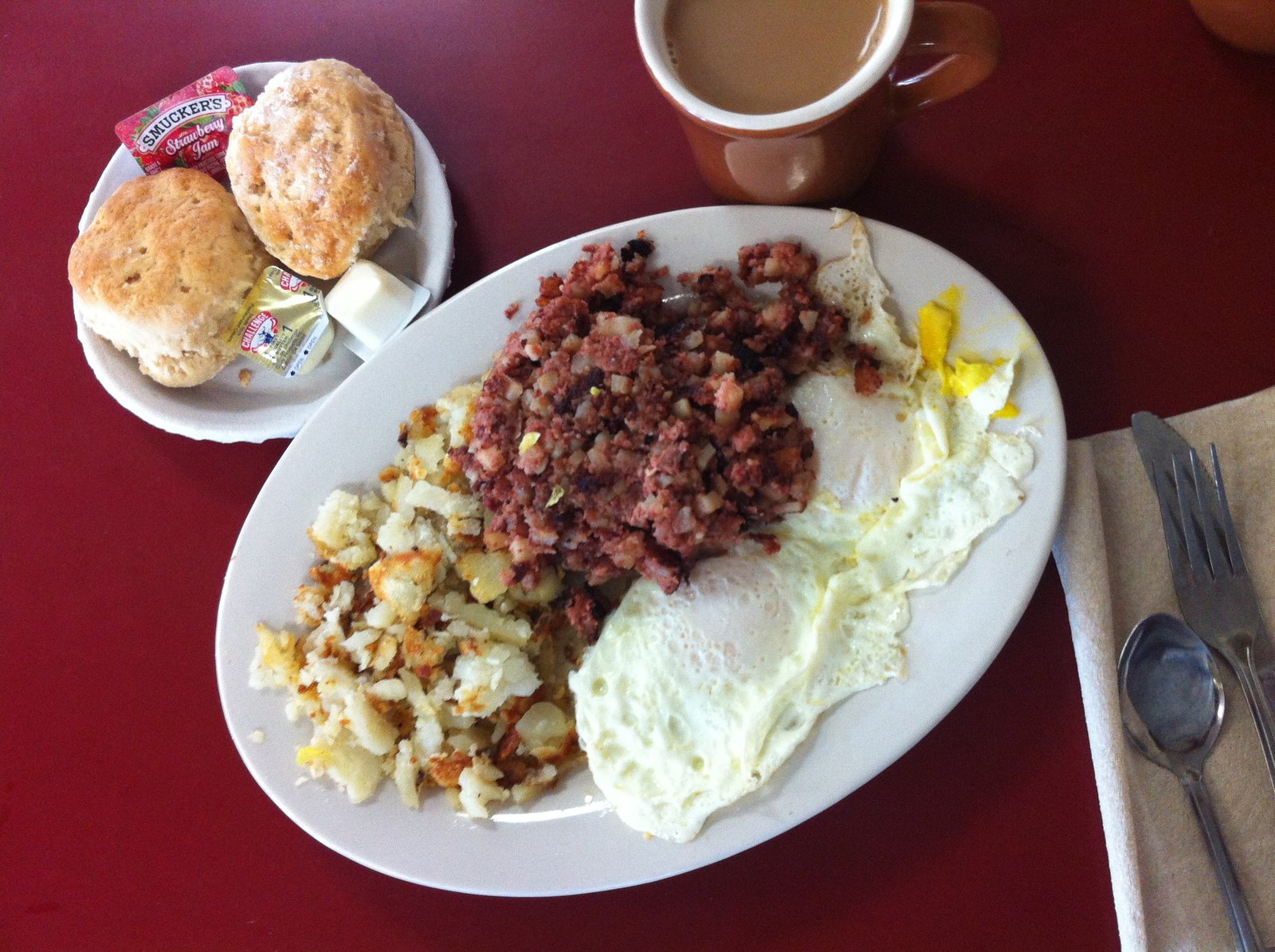 Soon enough, breakfast was ready. At the top is the Breakfast Combo Special ($7.50)- French toast, over easy eggs, bacon and coffee. The French toast batter has a bit of cinnamon in it, the bread is soft, thick and cooked just right (crispy on the exterior and soft and warm/fluffy interior). The bacon is thin and crispy and has flavor. Here's a better photo of the corned beef hash plate ($8.25)served with home fried potatoes and over easy eggs (again, coffee is included). The hash is wonderful -dry, not greasy- and has a great flavor. The Home Fries are made expertly, as are the over easy eggs and the biscuits (a classic baking powder/soda mix) – great short-order chefs.