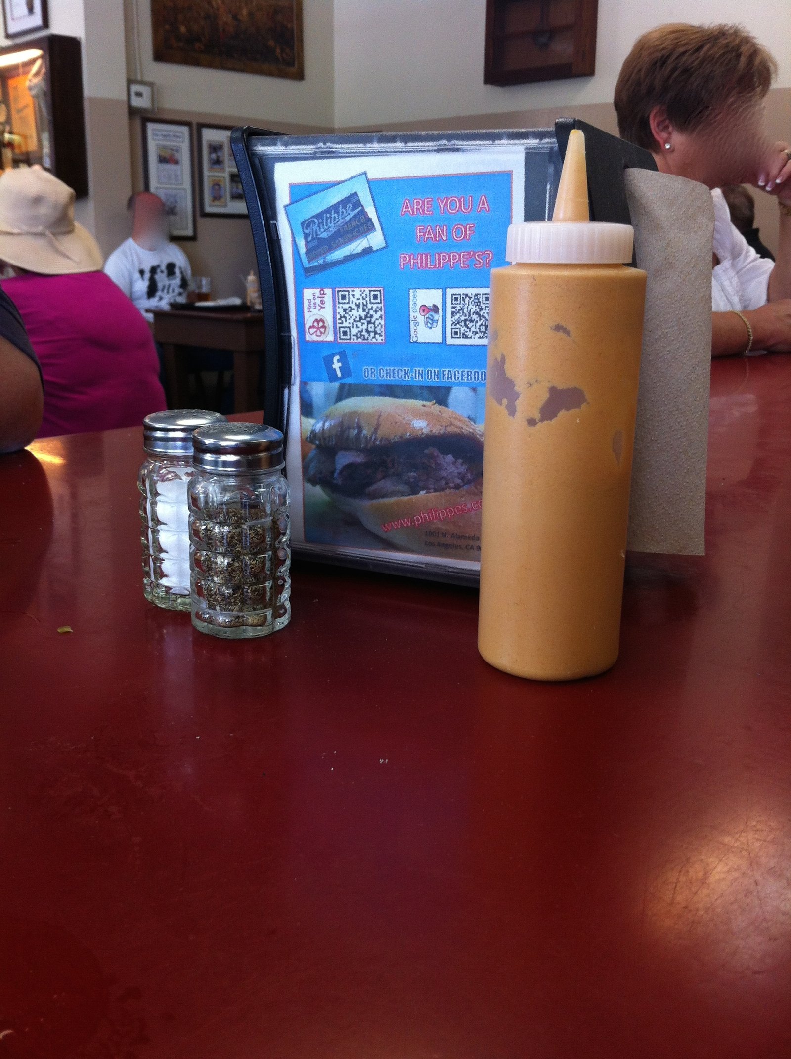 The ordering cases filled with a variety of sides, ten order/serving lines (there are only five at breakfast), ordered chaos, freshly sawdusted flooring, house made HOT mustard on each table. (Philippe is right next to Chinatown, which I'm pretty certain had an influence on the mustard recipe). Lunchtime.
