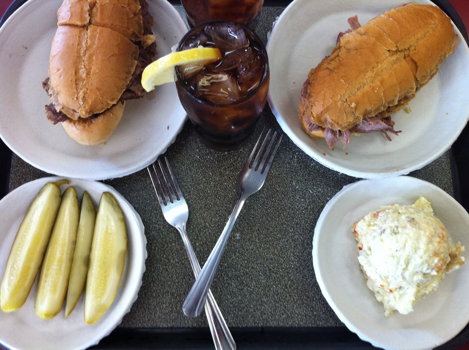 Double dipped (each piece of crispy fresh French bread gently run through the jus; opposed to a 'single dip' with only one piece of bread dipped) sandwiches of roast beef ($7) roast lamb ($8.50), sides of house made potato salad ($1.35) and pickle ($1.30) along with two glasses of iced tea (65 cents each).