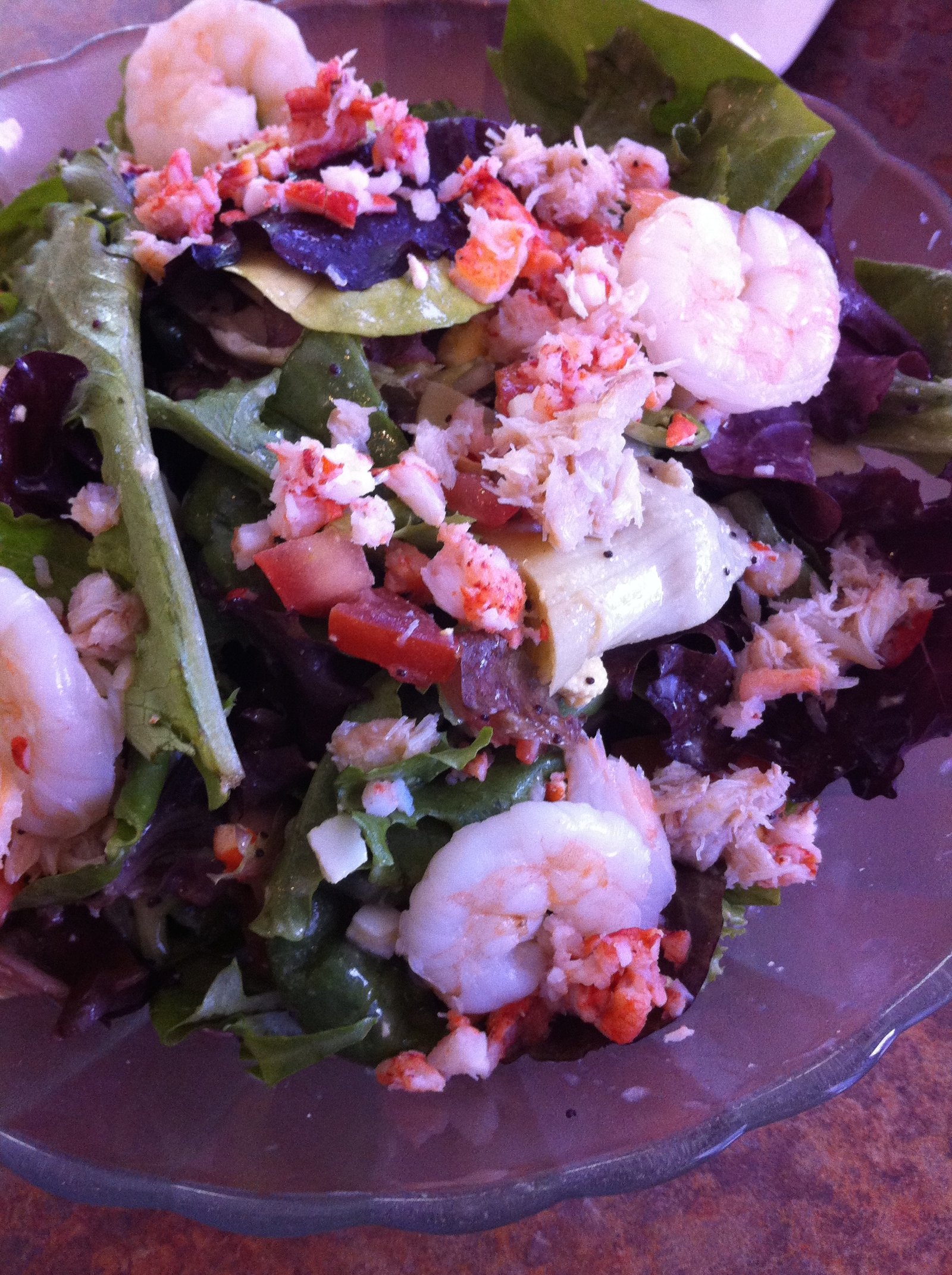 Above, the small Captain's salad ($10), which is large enough to share. Fresh mixed greens topped with shrimp, crab, lobster, artichoke hearts, organic egg, tomato and a house made mustard-poppy seed dressing. Really good.