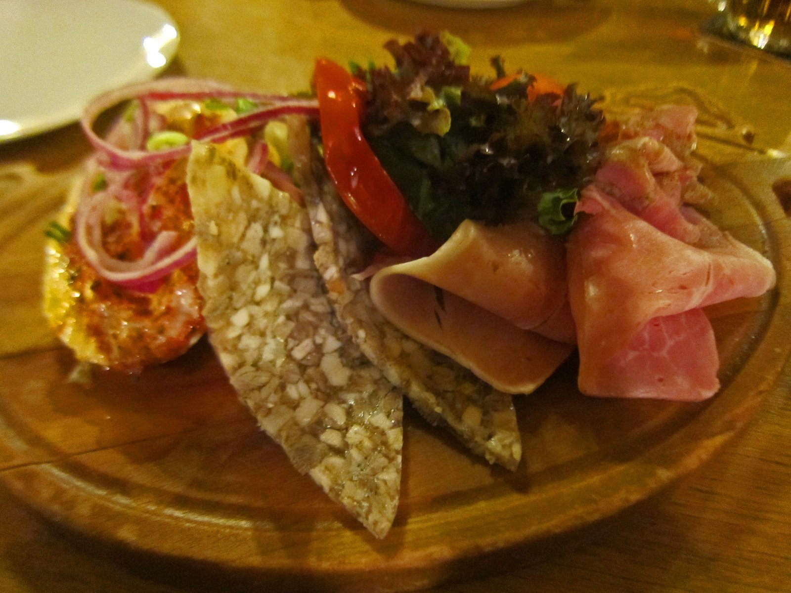 Much of the charcuterie was fairly routine; ham and head cheese. What we both really loved was the pickled sausage, called "Utopenci", which literally means "drowned man". Typical of Czech humor, this pickled sausage is either named after the creator of the dish, a pub owner who got drunk and drowned to death, or because the sausages bobbing in their jars resemble……drowned men. Either way, we loved the tart-sour-porkiness of it. We'd have it almost everywhere we could, even from Tesco, but this was our favorite by far….the most sour. The pickled cheese (nakládaný hermelín) had both that wonderful perky sour flavor and the fermented milkiness. It's made with hermelin cheese which is like camembert.