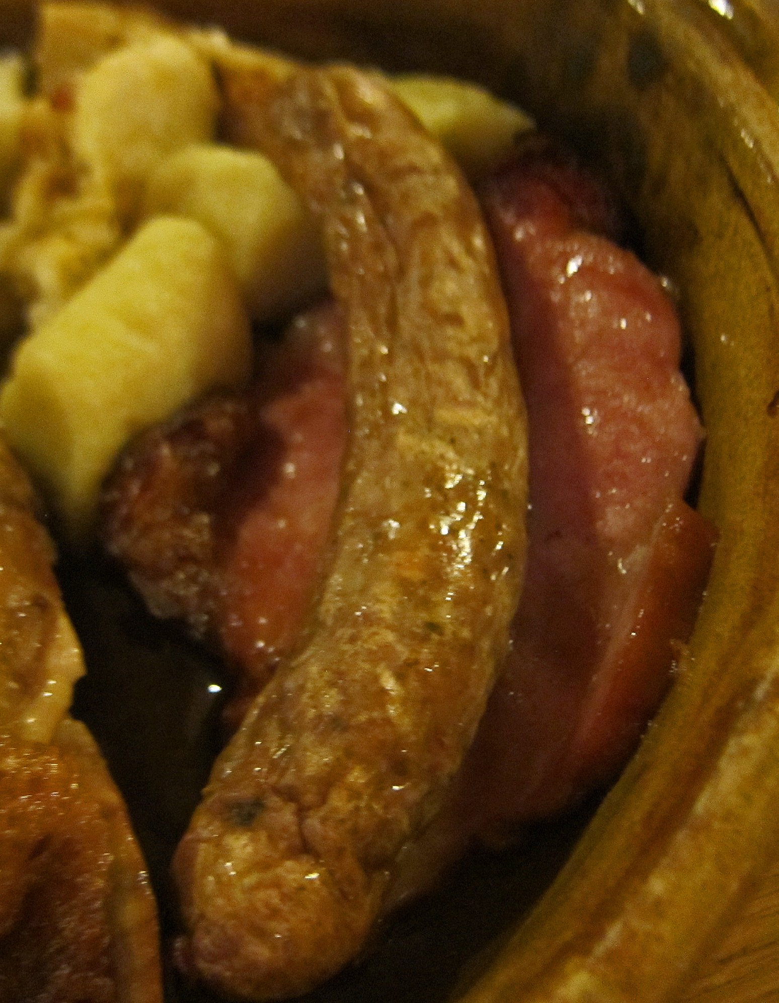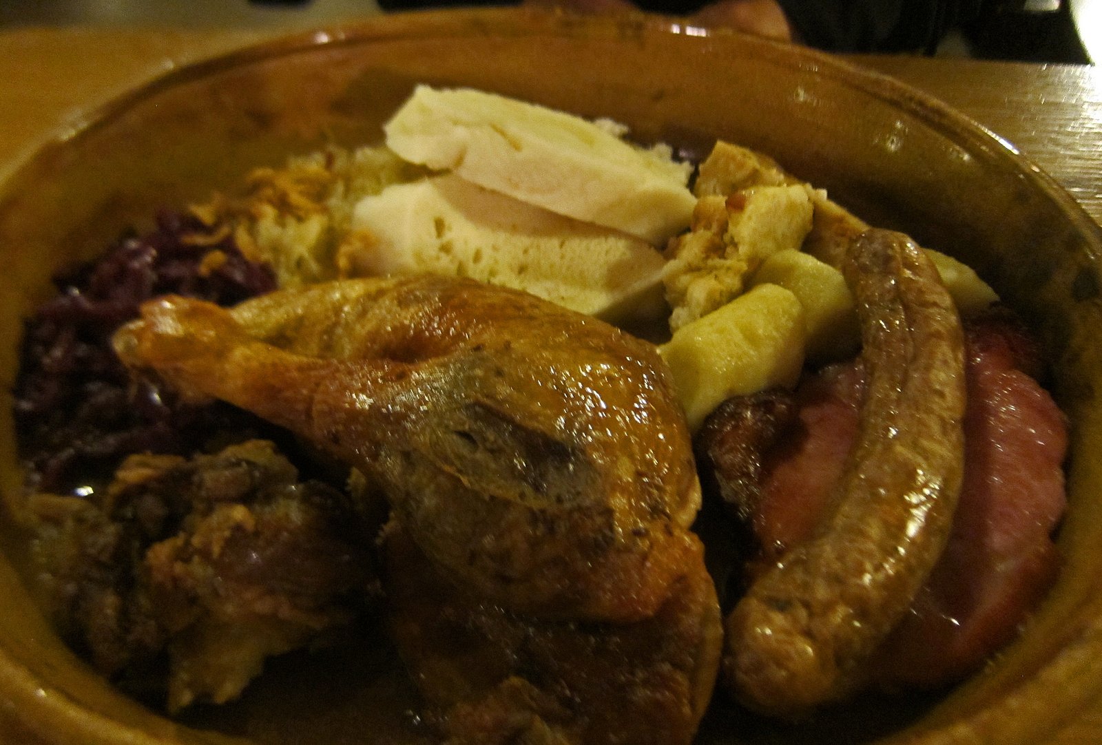 In case your keeping score; beer sausage, thick cut "bacon", smoked pork, sparrow (gamey), red and white cabbage, bread dumplings, and a duck leg.