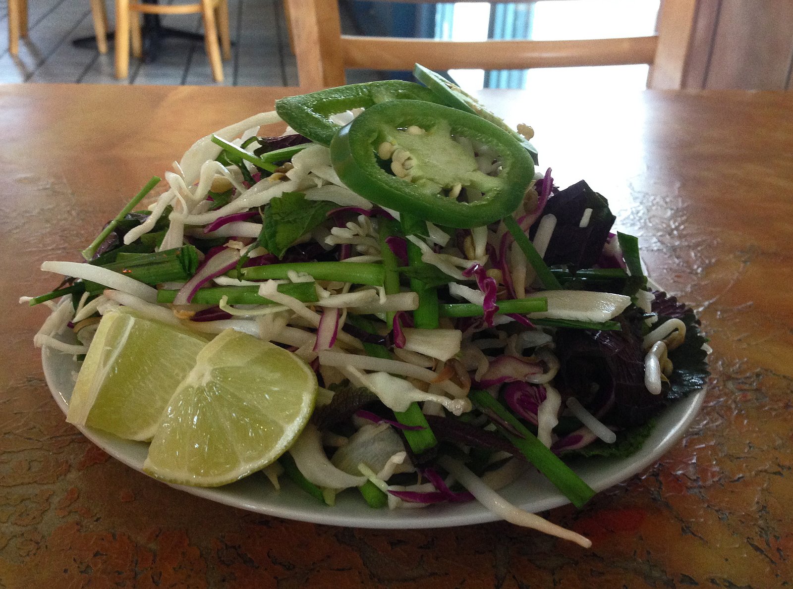 The last itme I visited, I thought the broth had taken a turn to a lighter and an almost sweeter soup. Well…..it was back to the good 'ol Nhu Y broth on this visit. Dark and funky, it was raised by the squeeze of lime and the melange of herbs to cut the thickness of the broth. It was also a bit more spicy…….like a broth that had been steeping for a while. This is one of the few soups that can overcome the rather muddy flavor of low grade catfish……you take in the smooth and buttery texture of the fish.