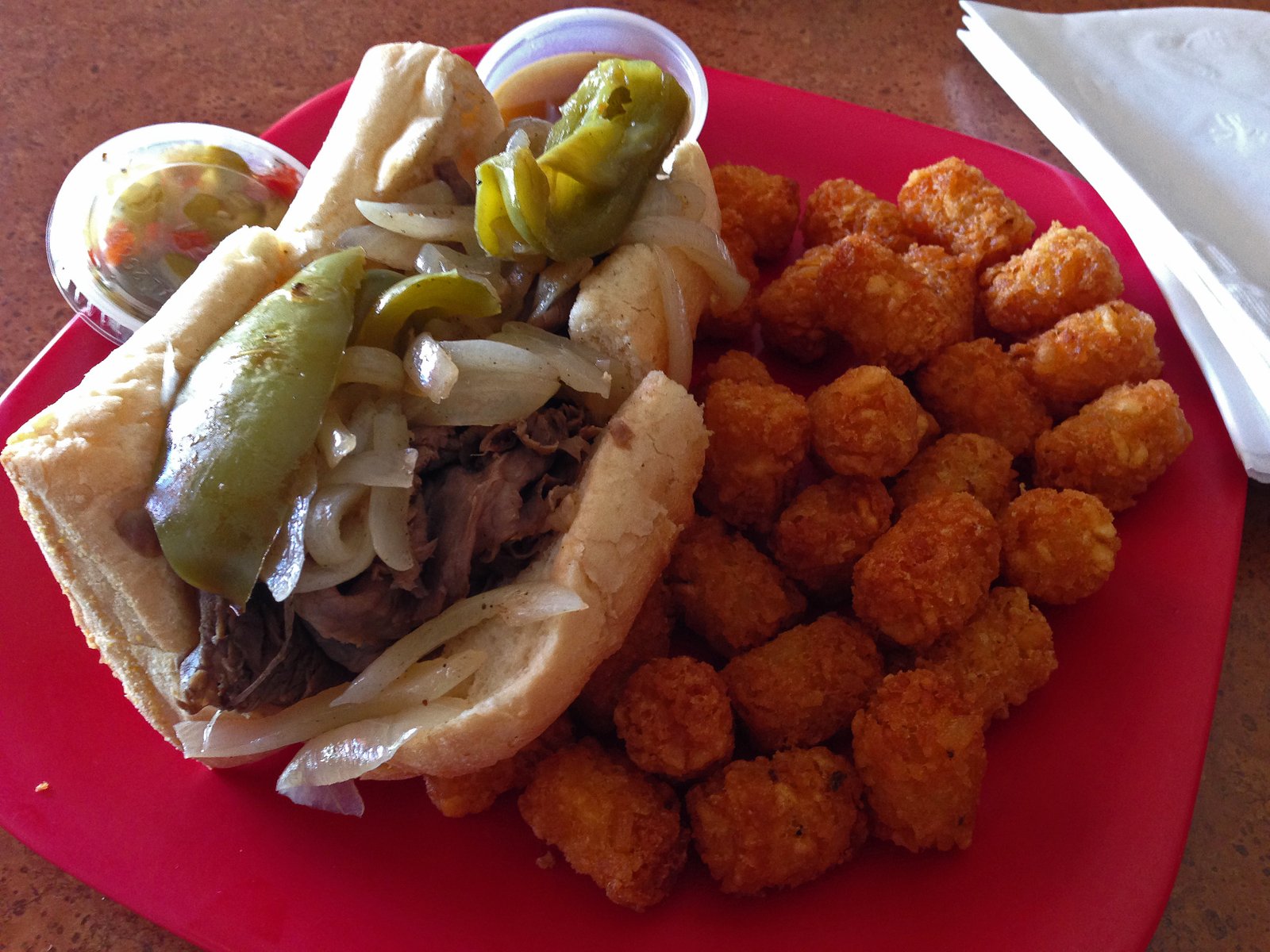 This was pretty much what I expected. In spite of the rhapsodic praises from my colleague, this was pretty much a glorified roast beef dip. The jus was lacking in beef flavor, the giardiniera seemed mass produced tasting like it had a base of Italian Dressing. The roll was much too hard….I like a little crusty, I appreciate the effort to stand up to wet beef, but this was much too hard. Speaking of hard, those tater tots were really fried "hard"….though it's hard to not enjoy tater tots, right? The onions were weird, heated but not soft….I say either saute them or serve them raw. I did enjoy the roasted jalapeno….not a classic addition to the Italian Beef; it's usually pickled hot peppers, but this did a some interest to the sandwich. I'd say Lefty's makes a better version of the "glorified roast beef dip in processed jus." To me, this really isn't a Chicago style Italian Beef, which I don't think exists in San Diego.