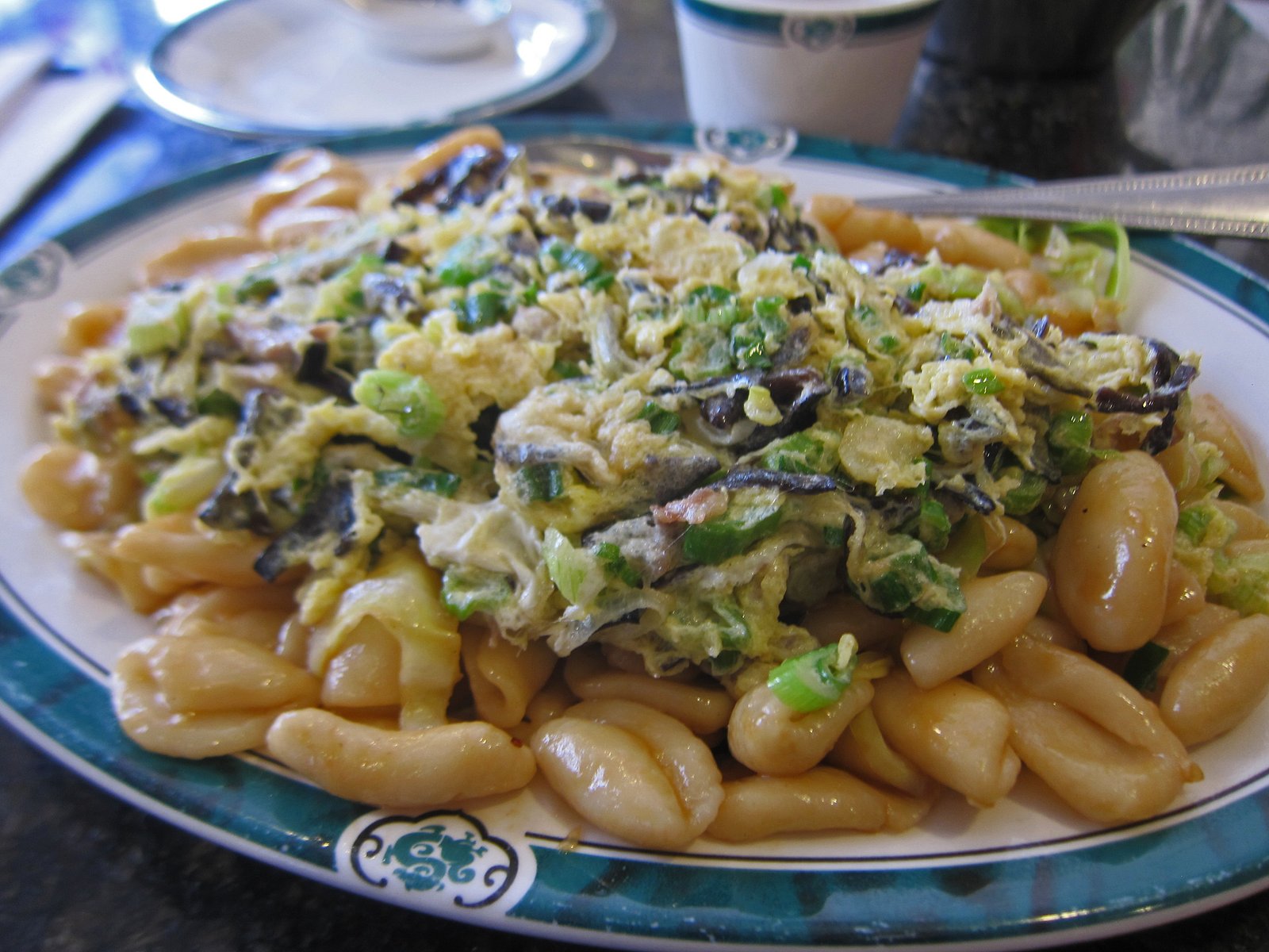 Very simply prepared, which is sometimes best, the noodle, which resembles Orecchiette, or as my coworker "Lily" who is from Shanxi, where mao erduo is one of the regional specialties says, "no, Orecchiette, resembles mao erduo." This version is quite chewy, almost dense, and hardens a bit as it cools. Quite substantial, it is stir-fried with soy sauce, garlic, a bit of napa cabbage, and a touch of sesame oil. It is topped eggs scrambled with scallions and wood ear fungus. Quite filling, I could only put away half of this before calling it quits. I thought it was fine, but nothing I'd go out of my way for in the future.