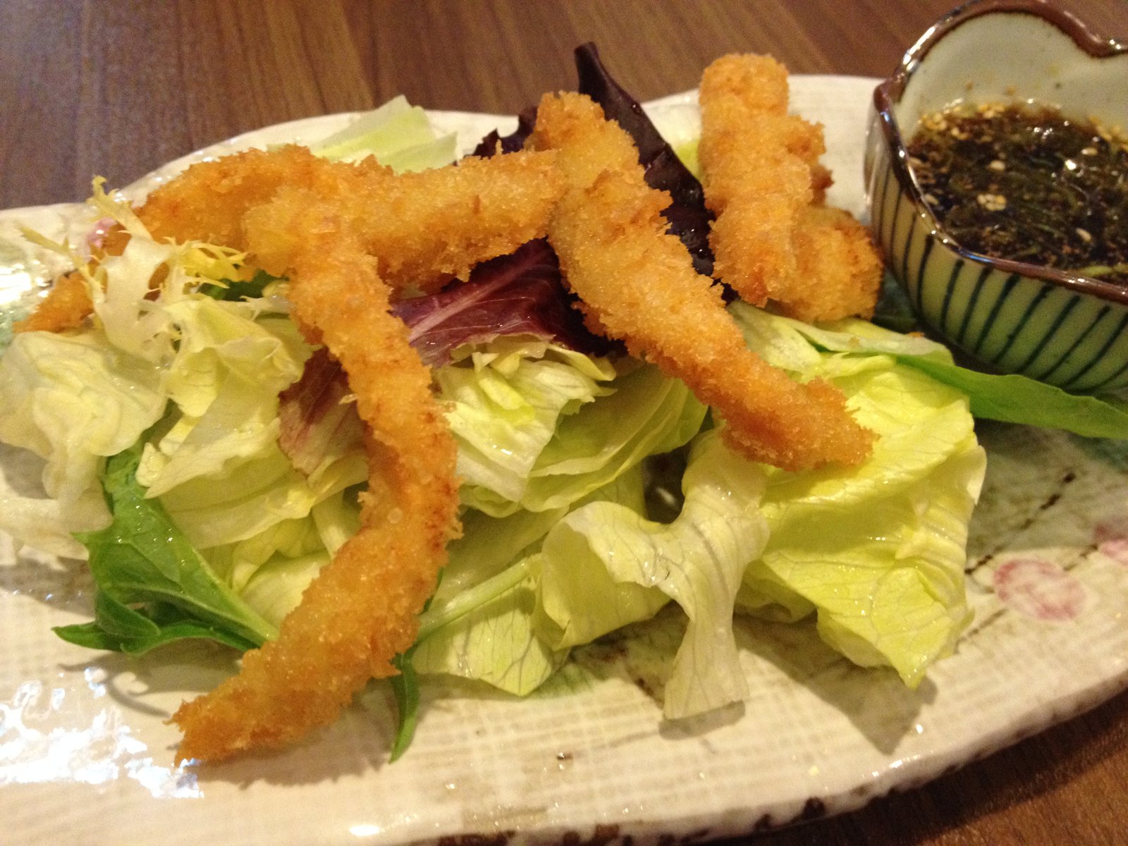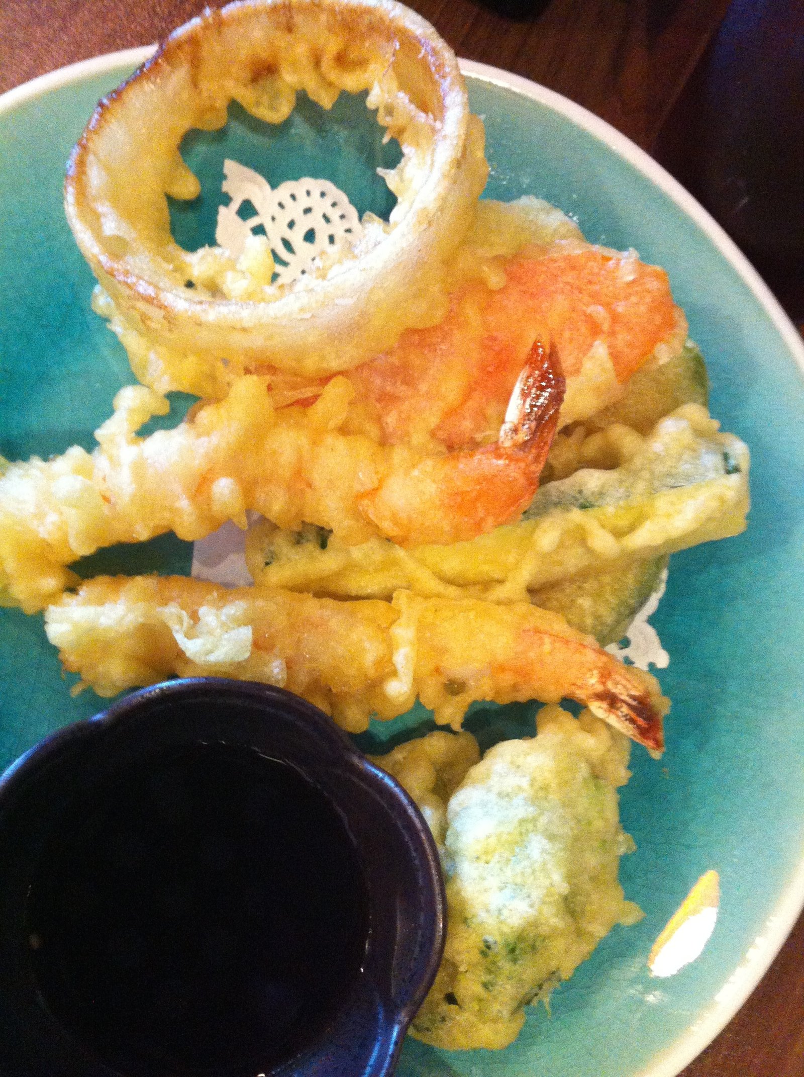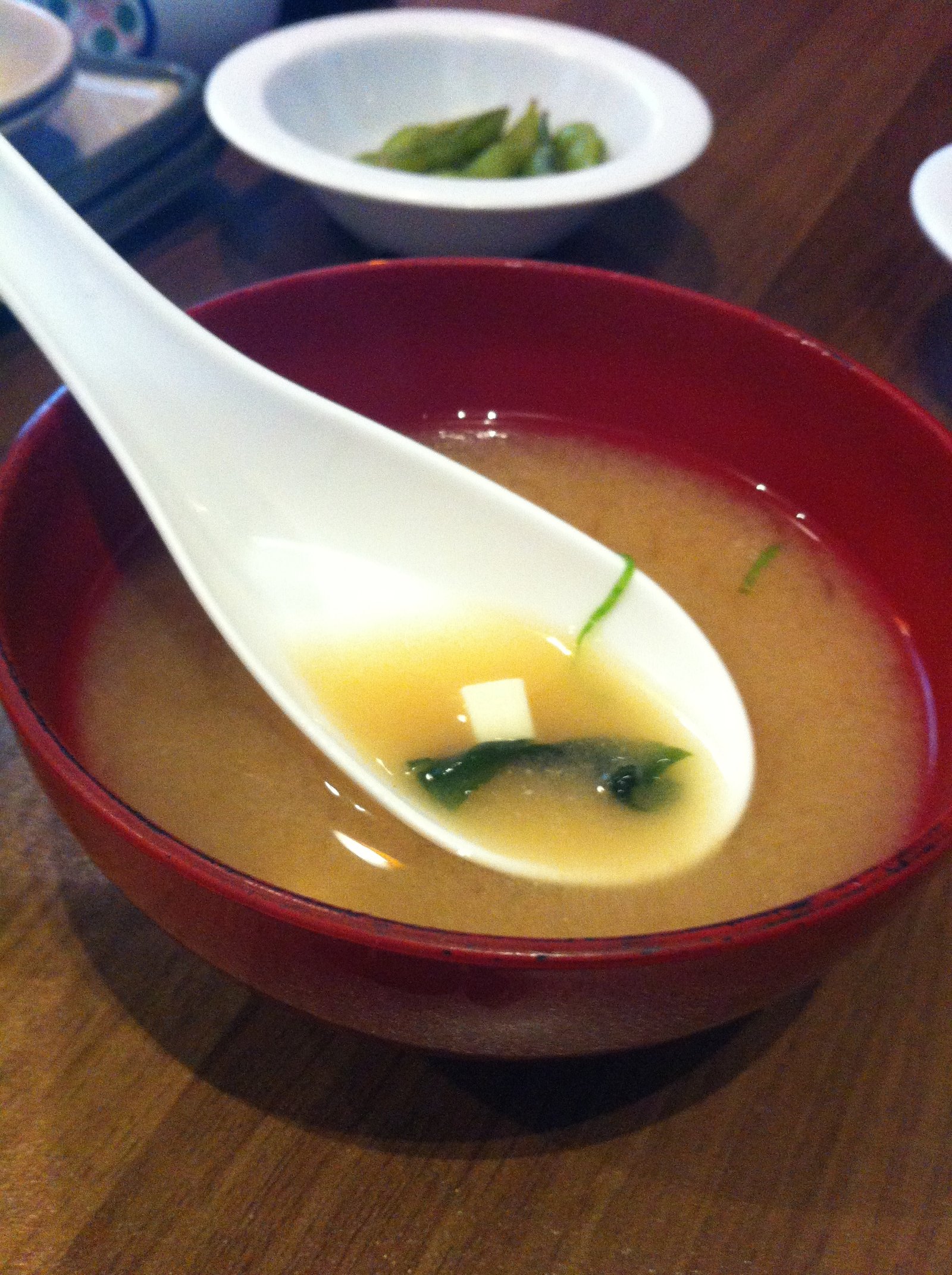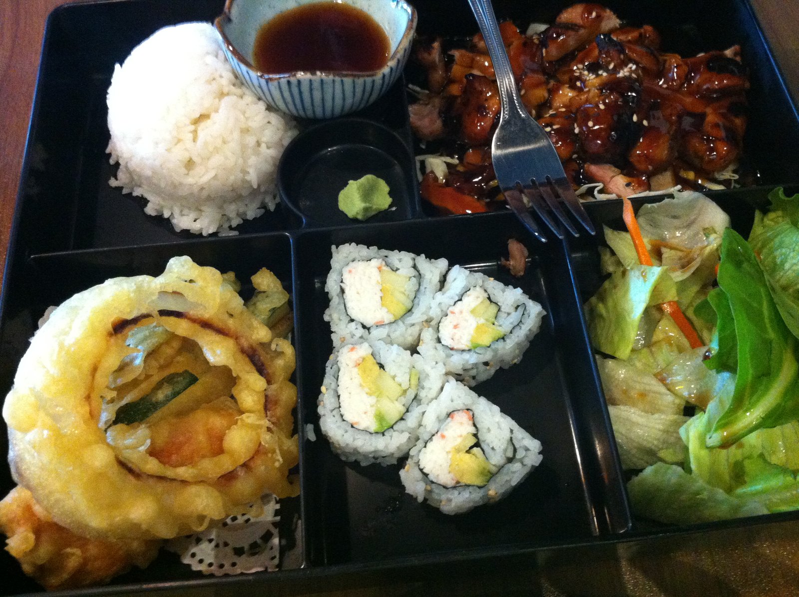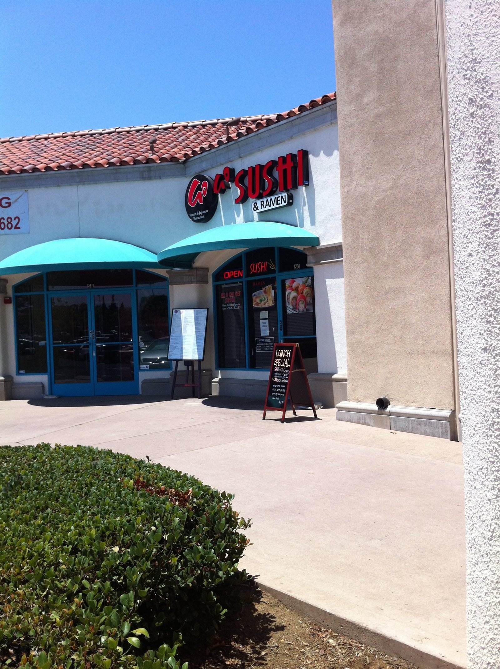 IMG_7446The full menu as well as a Specials Board is out front.  The two times we were here, the Specials were the same…IMG_7438IMG_7418IMG_0426The interior has been redone and is not as jarring (when the space was Po and Pho, florescent lights were  almost too bright for my old eyes). Complimentary edamame was served.  A better soy sauce is the only condiment on the table. IMG_7421 For the first visit, The Mister's order came with miso soup (mine didn't) but the nice waitress brought me a complimentary bowl.  That was nice.  It was good; pretty standard.IMG_7425 The Mister ordered the 'Lunch Special' bento box ($6.95 and included a beverage; regular $7.95 without beverage)).  Teriyaki chicken (a more citrus rather than sweet flavor sauce), California roll and tempura vegetable along with rice and salad.  The nicely grilled chicken and sauce was plentiful, the California roll was fresh (warm rice; good) and the tempura was properly fried…salad dressing was tasty. IMG_7433 Because of the hot day, I had decided I wanted a salad and ordered the "Hawaiian Poki" ($9.95)(that's how it is spelled on the menu), which was wonderful.  A good amount of fresh, properly marinated tuna on top of a seaweed salad, topped with crushed macadamia nuts.  This was very satisfying.IMG_7436 We also ordered the mixed tempura side ($4.95) which included two pieces of shrimp as well as broccoli, onion, zucchini and sweet potato all breaded and fried properly.IMG_0430Next visit, I wanted to try the calamari salad ($7.95).  It's listed as an appetizer.  The size was a disappointment.  You can see only five small strips of fried squid and it wasn't really enough for me, much less to be shared. There was plenty of lettuce…but still.. one thing I would not order again. IMG_0428 Many people here during each visit were ordering sushi rolls from the five pages or so of their listings on the menu.  However, the table placard caught our interest.IMG_0437The tonkatsu ramen with a side of tonkatsu. ($7.95 + $2).  The broth was very rich and deeply flavored; the BBQ pork pieces were meaty and moist; I especially liked the egg; the noodles had a nice tooth and this was well made. The side of tonkatsu was fried by the same guy who did the calamari pieces for my salad… too thin, too crispy…