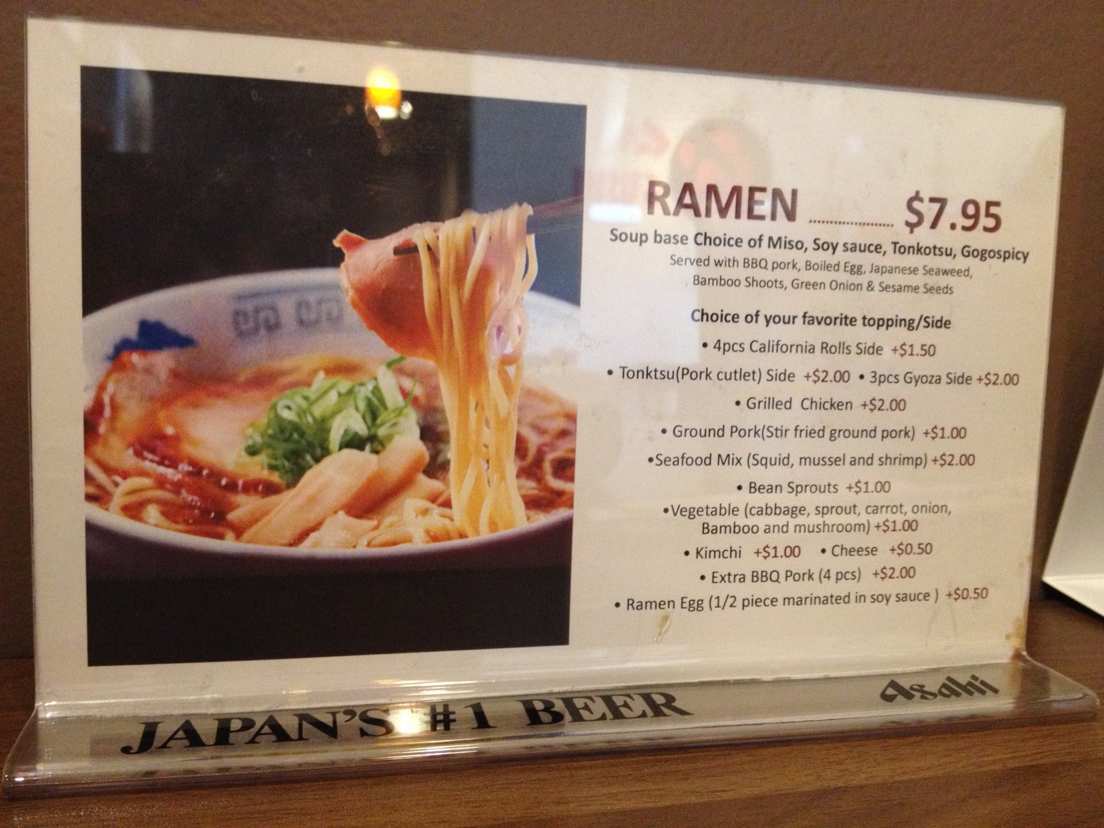 5. The ramen was very satisfying here, Mary. The broth, noodles and filling were excellent…yes, the egg. The optional sides are a curiosity (cheese?).