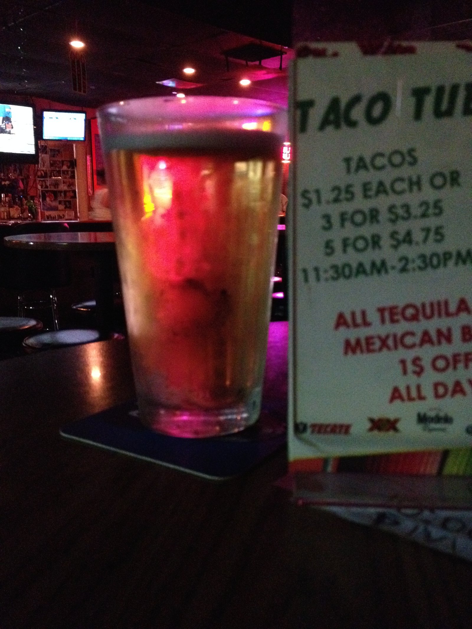 Once inside, there are four televisions above the bar, lots of signage about specials and a large selection of beer, and liquor…(the pint beer on tap is $3.75).