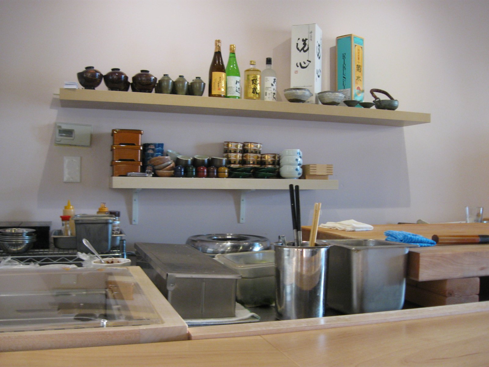 The arrangement of the sushi bar’s workspace itself struck me as unusual. There was no glassed-in display of fish. In addition, a large preparation area adjoined the bar so that the itamae, Akio-san, worked behind the large wooden cutting board and rice tub and handed trays or plates to the server who would then place them in front of me at the bar or people at a table:
