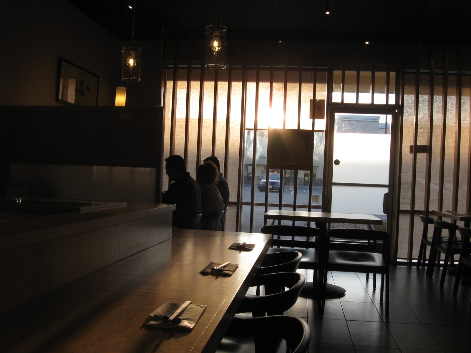 Inside there were a few tables, one holding a party of six or eight individuals, and six seats around the sushi bar: