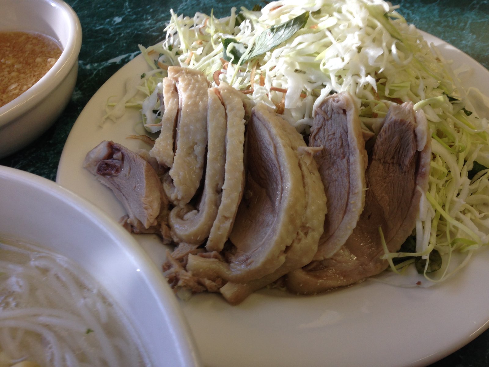 The "goi vit", basically the duck and "salad", a combination of greens, herbs, and shredded banana blossom proves a nice counter-point. The duck, sliced, nicely flavored with a bit of chew.