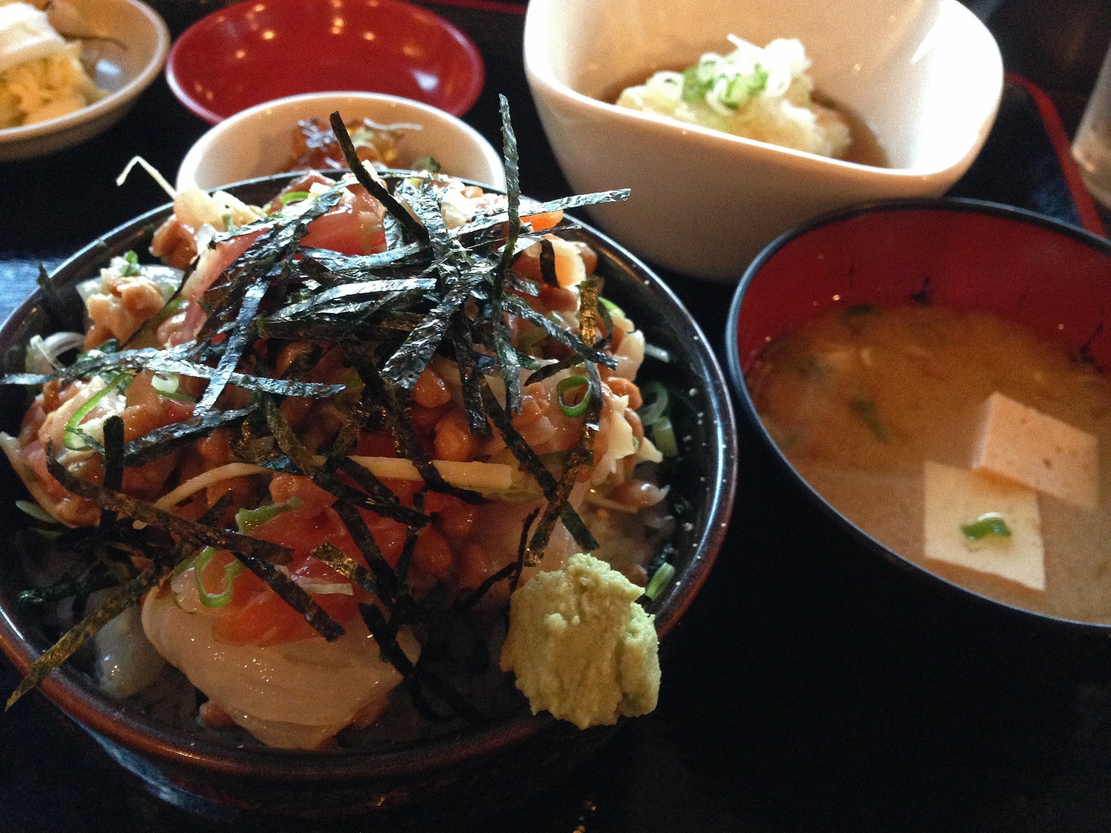 The combination of raw fish and ika (squid) combined with the sticky stringy natto was just what the doctor ordered. Soy sauce and wasabi just brought everything together for me. The agedashi tofu that comes with this wasn't cooked properly, the coating was gummy and didn't hold up…. otherwise, this was the perfect meal for today.
