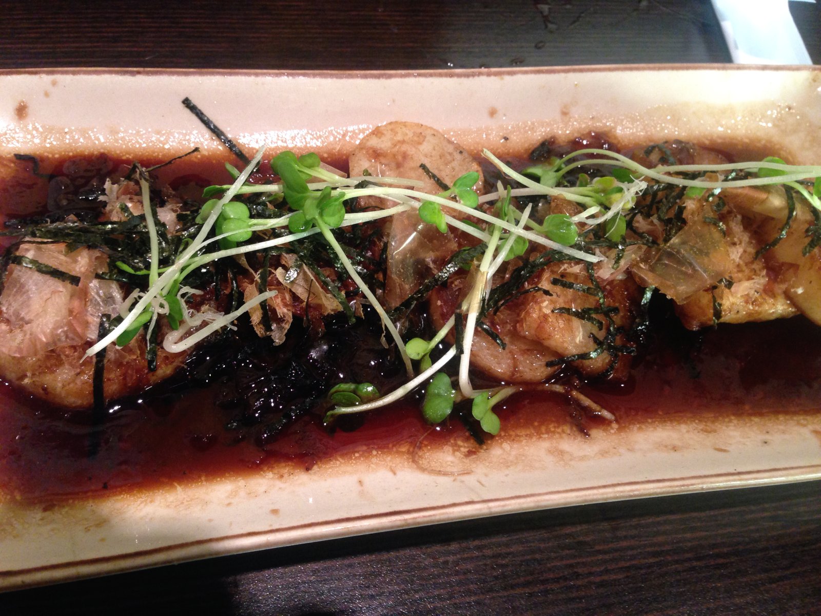 First the good; the dashi was fair, not too salty, nice sweet-salty balance. The skin of the eggplant was super tough, versions I've had of this dish, the eggplant has been deep fried, then hot water is poured over the eggplant ot remove excess oil, it is usually tender, this was pretty tough. You might find this strange, but the thing that I really didn't like about this was the daikon oroshi. For some reason it was really dry, like all the liquid had been squeezed out of it and it had been sitting around that way for a while…hard with no flavor.