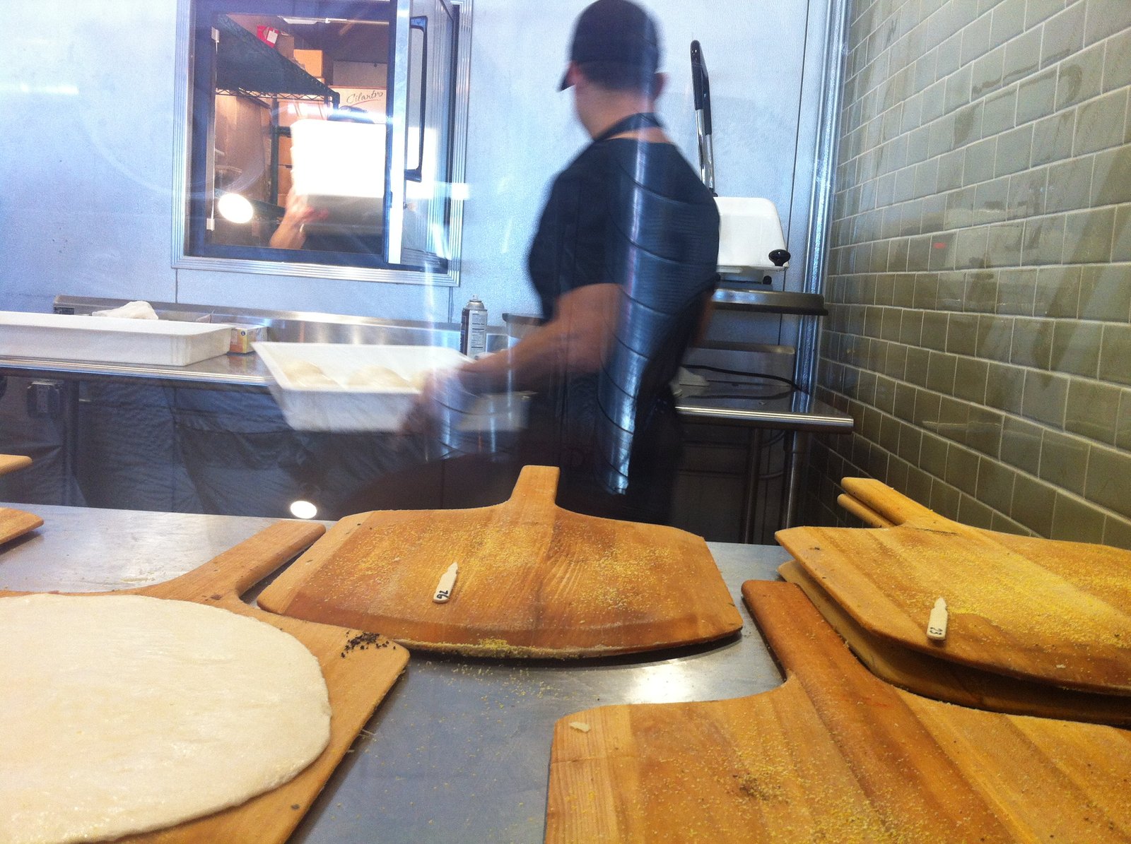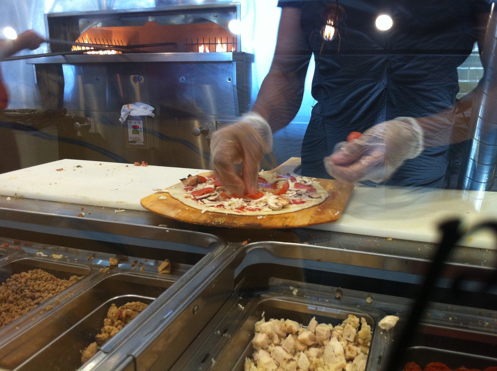 Neat, clean, industrial looking with the current decorating trend of communal tables in the center of the seating area, the drill is the same: order, watch your pies being customized while following them along the line…