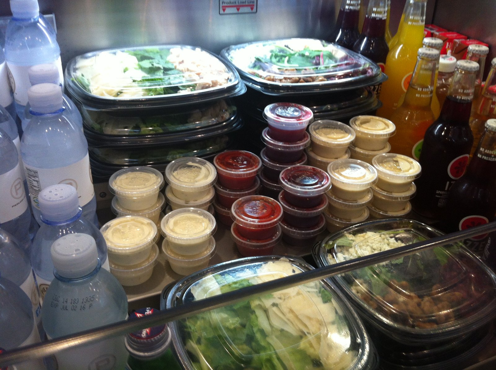 Choose a beverage or salad and pay, have a seat and your order will be brought out to you.