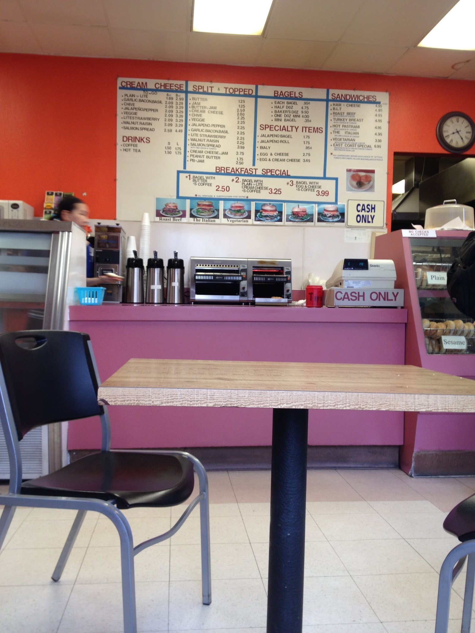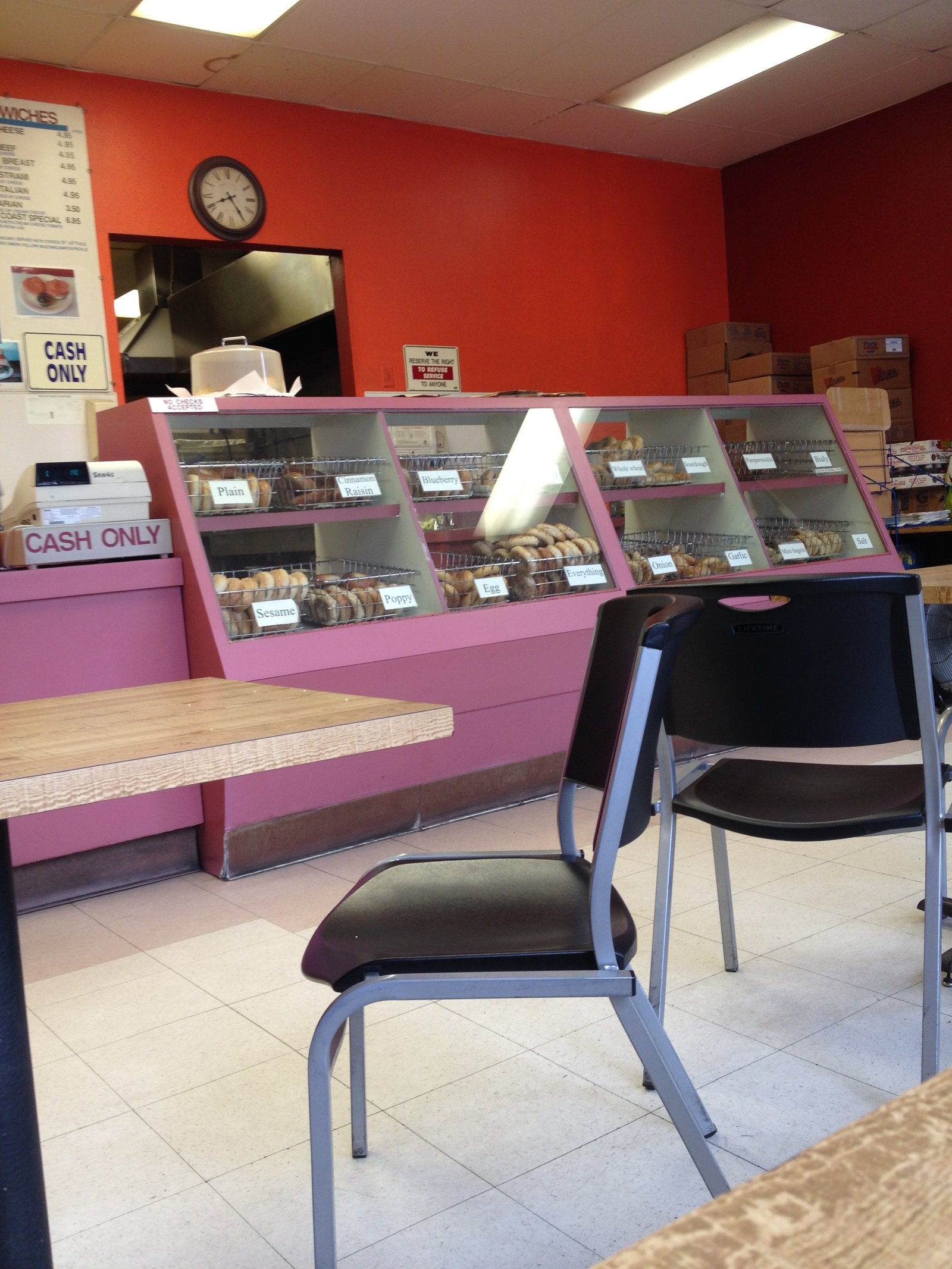 As I was beginning to write this post, noticing the other posts written about P.L. Bagels were also from October must mean it's just the time of year I get around to writing about a fairly regular weekend stop.Open at 6a.m. daily, P.L. Bagels is located at the corner of Voltaire at Palermo, just a block West of Point Loma High School. In a small, tight parking lot for the various businesses – a Donut Shop, Taco Shop, Pet Food store and Pizza Place- it's been there since at least the mid 90's, originally opened by a New Yorker, who wanted to bring 'proper' bagel making techniques and flavors to San Diego, eventually sold to a very nice family (who are the only ones working here) maintaining those recipes.