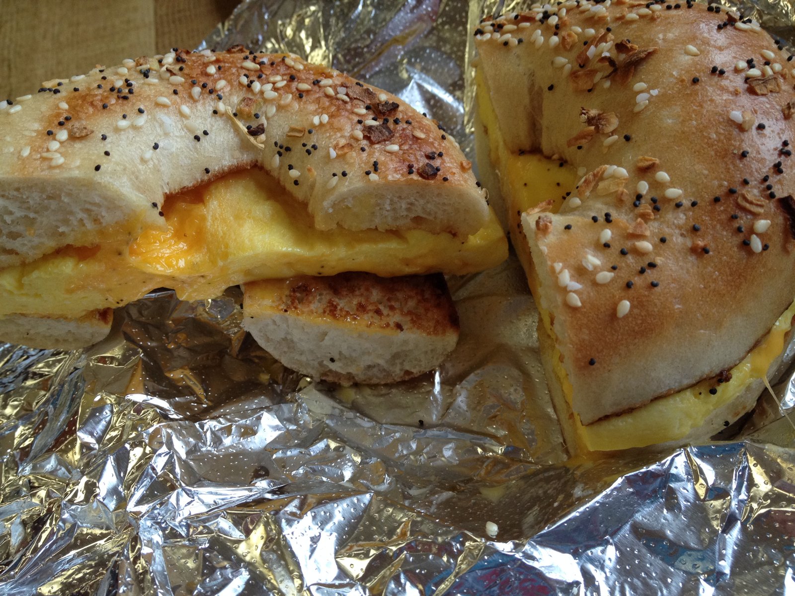 The egg and cheese bagel with coffee is $3.99. This 'everything' bagel is a usual choice when unable to decide. The second photo shows both the top and bottom of the bagel- another thing I like about the bagels here- coated and not just topped with the toppings.