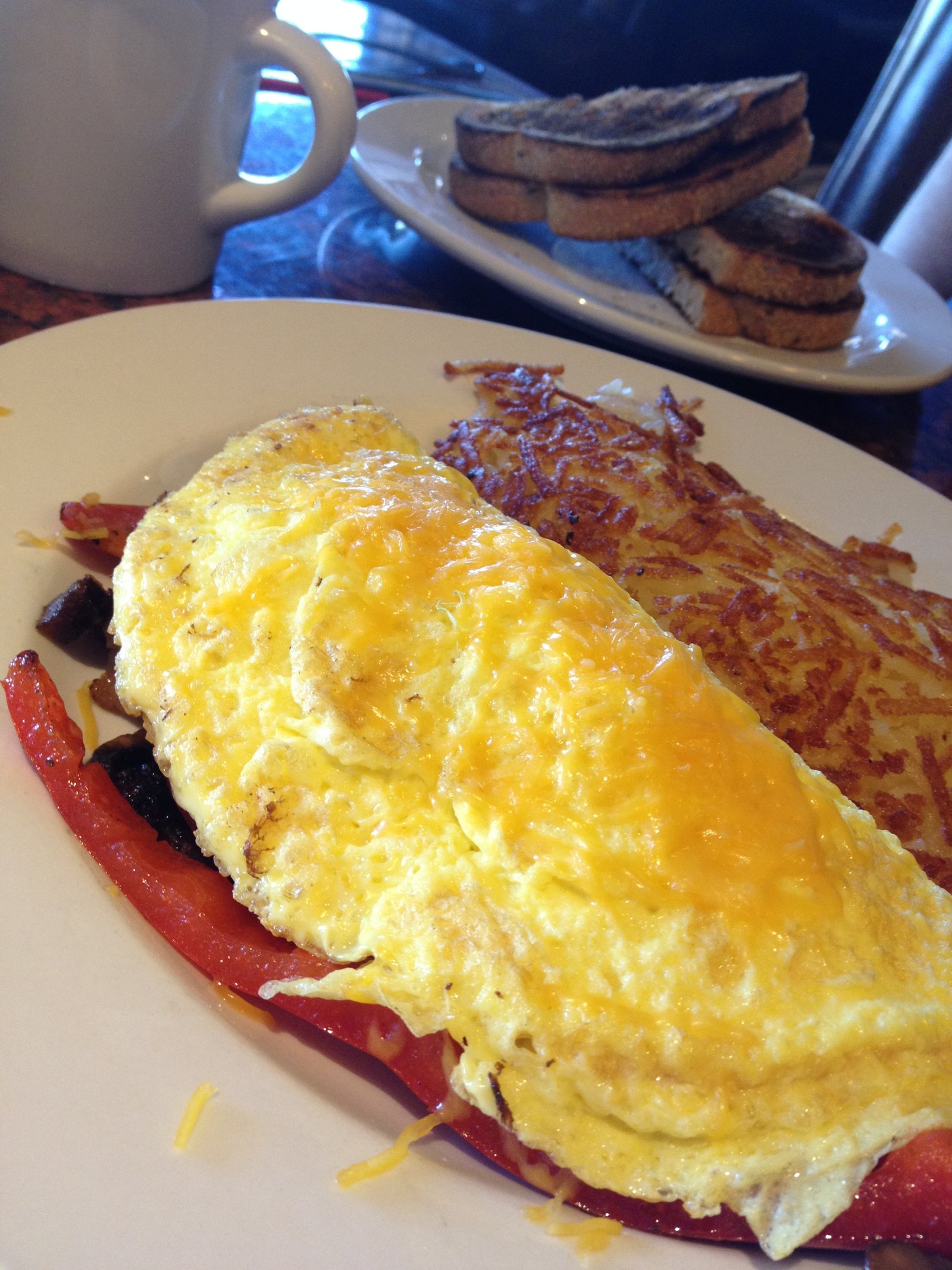 The breakfast omelette special ($5.99) is made up of three eggs and any four ingredients you choose. It comes with hash browns and toast. As you can see, the ingredients chosen were cheddar cheese, red pepper, mushrooms and diced sausage. This is a lot of food. The regular (weekend or after 10 a.m. weekday) price of this omelette is $9.45.