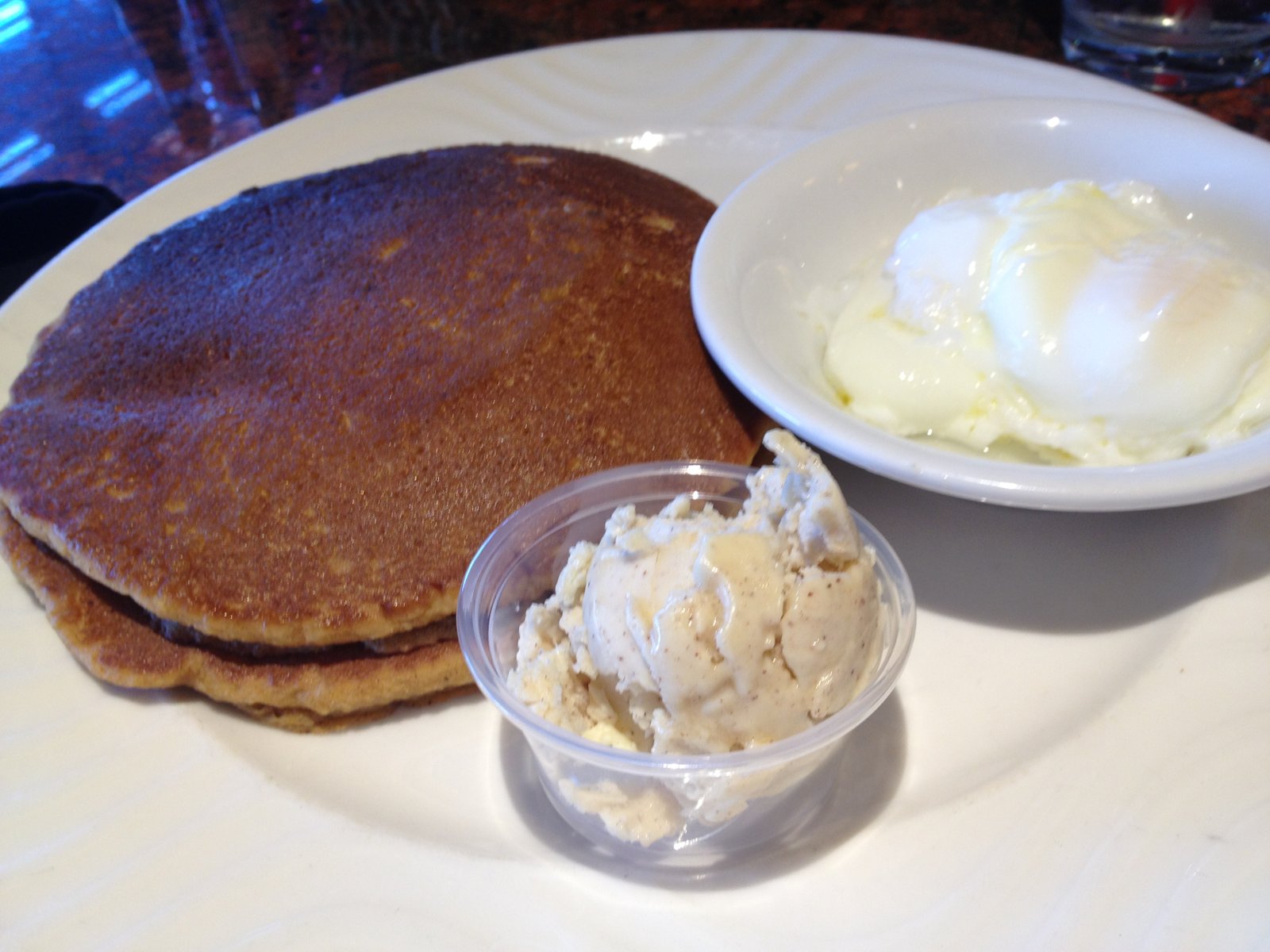 Another breakfast choice we enjoy from here are the sweet potato pancakes and eggs (5.95). Poached is always my preference and the chef here is good at poaching. The butter that accompanies the pancakes is a vanilla-cinnamon blend and quite complimentary in a non-pumpkin spice way.